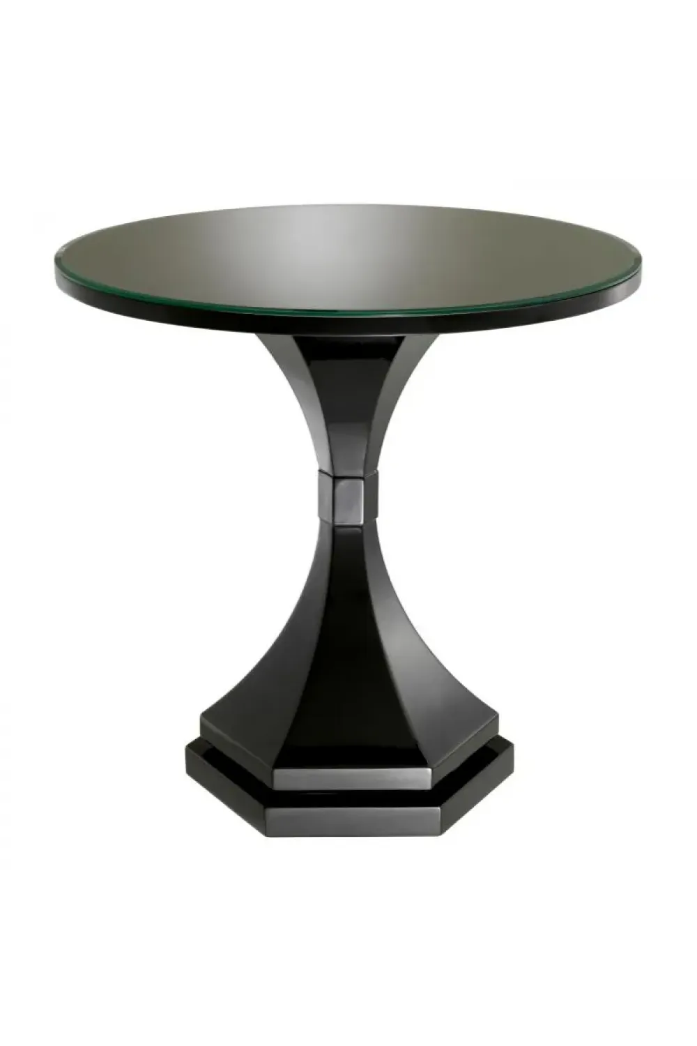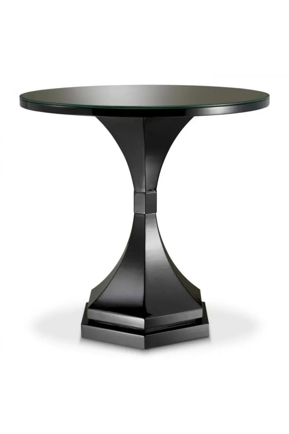 Luxury piano black finish round side table with clear glass top featuring a sleek design inspired by classical architecture. Crafted with mahogany and MDF, this side table seamlessly blends historical elegance with contemporary charm. Ideal for sophisticated interiors, its refined clear glass table top adds lightness to any room. A perfect addition to modern luxury side tables, offering both style and function.
