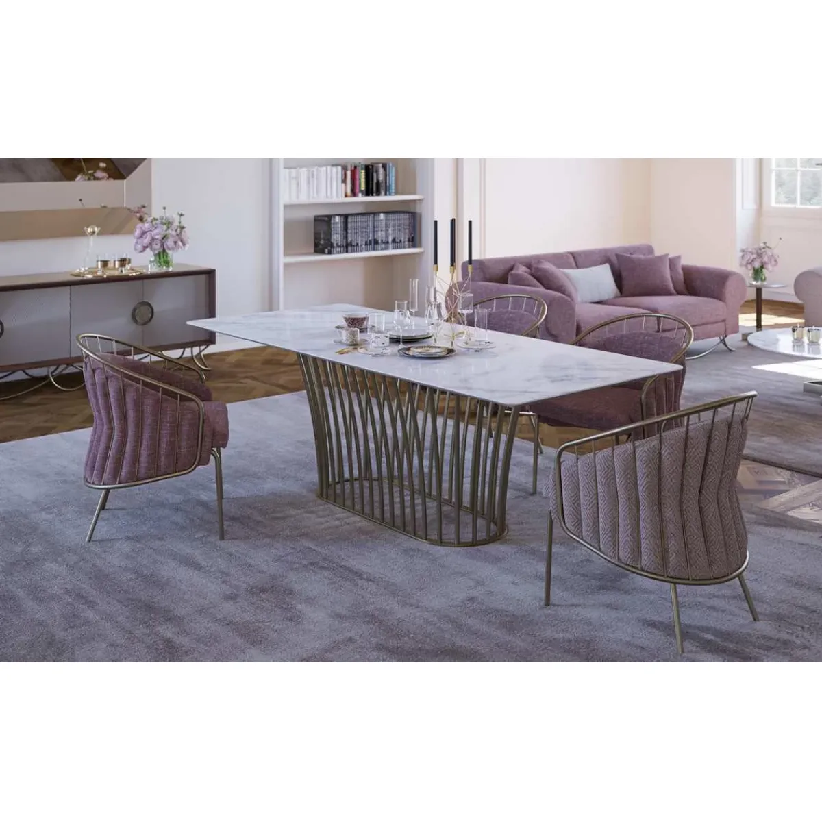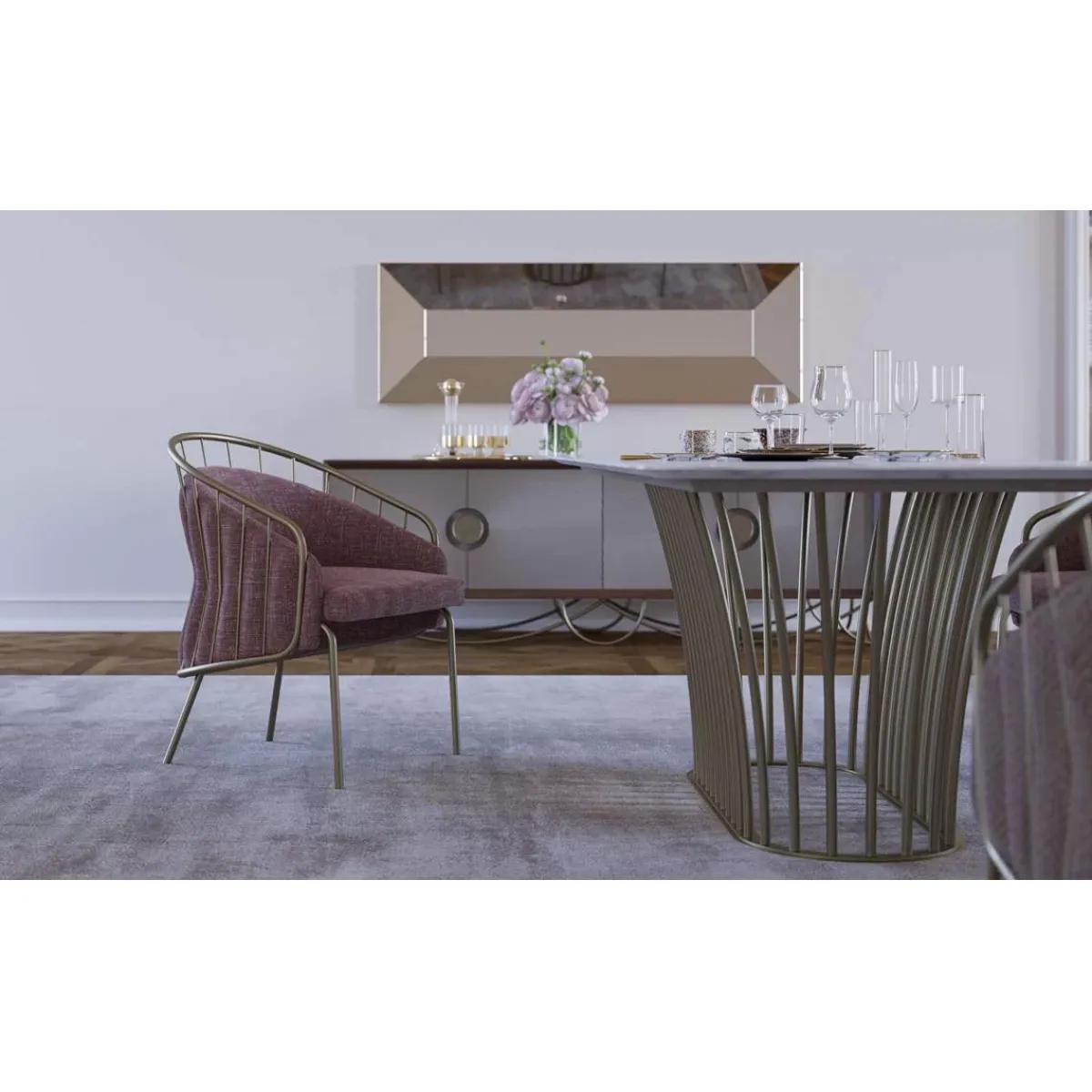This luxury pink upholstered dining chair is not just a statement piece but also an ergonomic seating solution. The geometric design of the metal spokes in the backrest ensures both comfort and style, while the sturdy frame provides stability. Whether placed in a modern dining room, a chic office, or a luxury living space, this dining chair adds an elevated touch of sophistication.