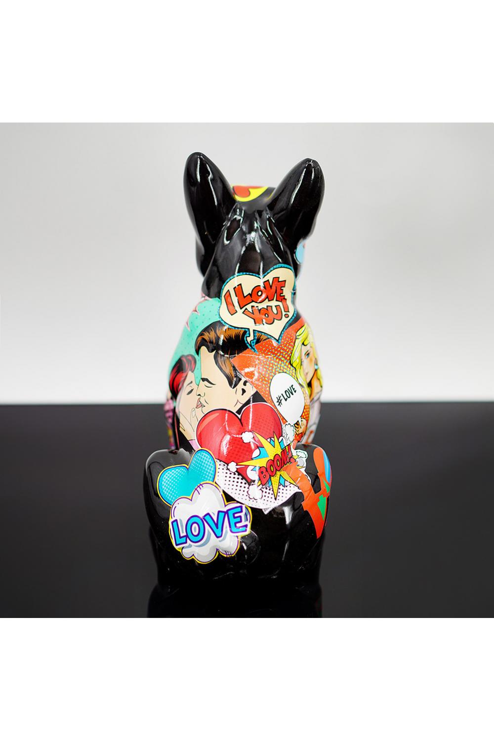 This distinctive French Bulldog sculpture blends contemporary design with the lively spirit of comic art, making it a standout element for modern decorative styling. Wrapped in a richly detailed collage featuring speech bubbles, romantic pop art imagery, and iconic graphic motifs, it captures the essence of expressive modern contemporary sculpture.