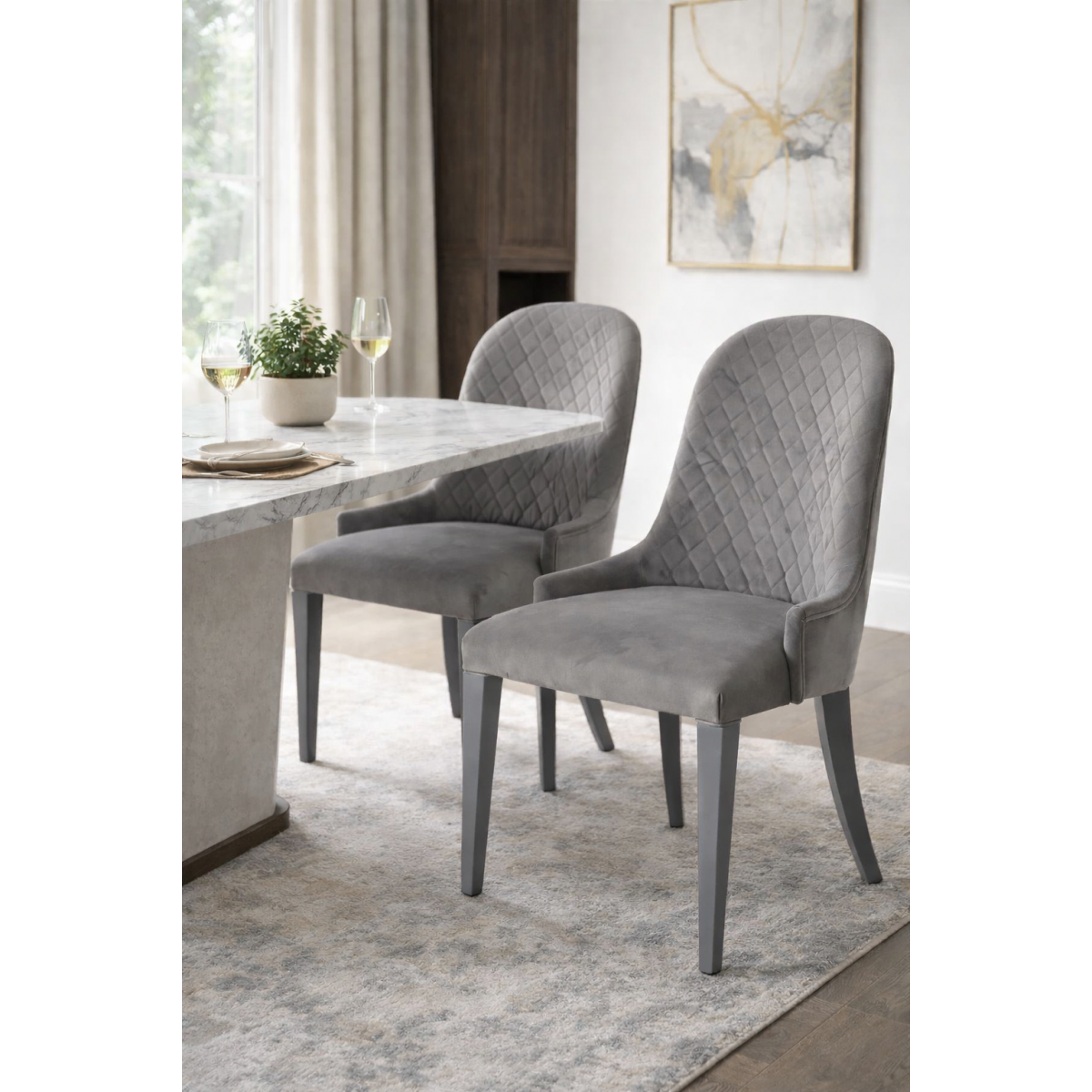 Luxury Quilted Upholstered High Oval Back Dining Chair in Warm Grey Finish represents contemporary European refinement through its elongated silhouette and graceful curvature. This luxury upholstered dining chair features a distinctive high oval back adorned with subtle diamond quilting, adding dimension and texture while maintaining a clean, sculptural profile. The generously cushioned seat ensures balanced support for extended dining, while the warm grey upholstery introduces depth and modern sophistication to refined interiors.