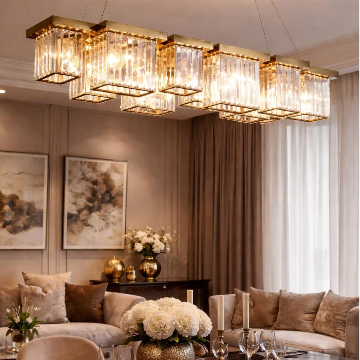 The Luxury rectangular Brass finish modern glossy ornate crystal chandelier with Cubic Design is a statement lighting masterpiece designed for elegant contemporary interiors. Crafted with a refined metal structure and adorned with vertically aligned crystal prisms, this luxury rectangular Brass finish modern glossy ornate crystal chandelier creates a stunning architectural lighting composition. The layered rectangular arrangement gives the chandelier a sculptural presence while allowing light to refract beautifully through each crystal element. When illuminated, the sixteen E14 light sources generate a warm glow that reflects across the crystal rods, producing a sophisticated sparkle that enhances the ambience of luxury interiors. The brass-toned frame introduces warmth and refinement, making this crystal chandelier an exceptional focal point for modern living rooms, grand dining areas, and luxury residences.
