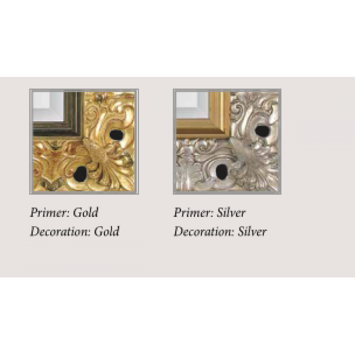 This mirror is currently offered in Primer: Gold with Decoration: Gold; a sophisticated Primer: Silver with Decoration: Silver finish is also available, while further primer and decoration variations may be produced upon request to suit individual interior visions and bespoke design requirements.