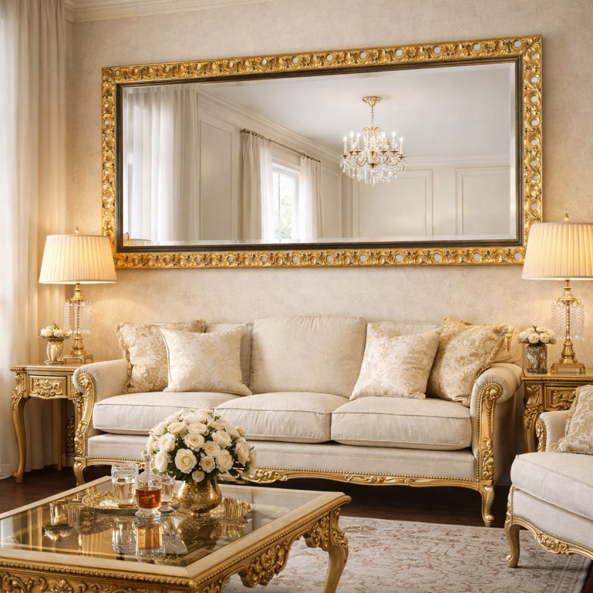 A distinguished creation from our exclusive collection of luxury baroque mirrors, this handcrafted rectangular design reflects refined European artistry. Perfectly scaled as one of the most elegant luxury mirrors for living room, it enhances interiors with sculpted medallion detailing and radiant gold finish.