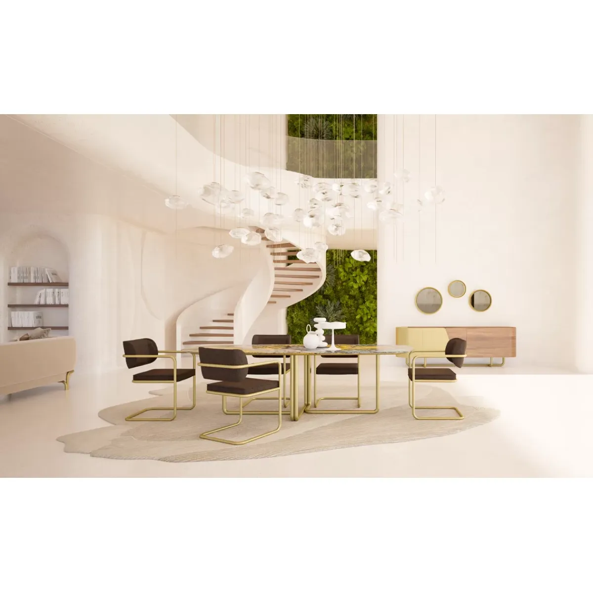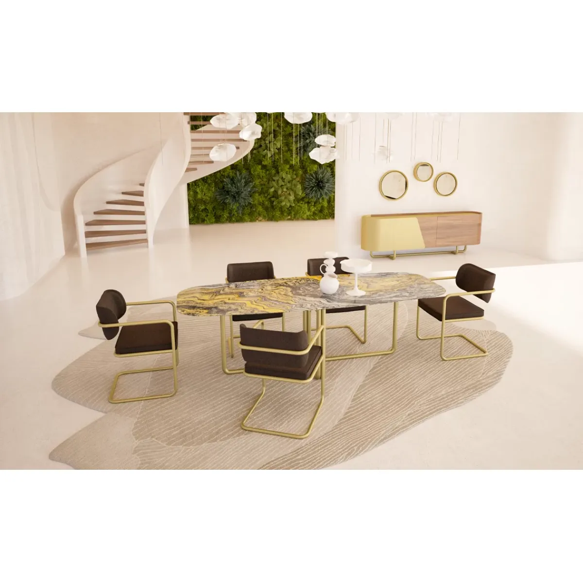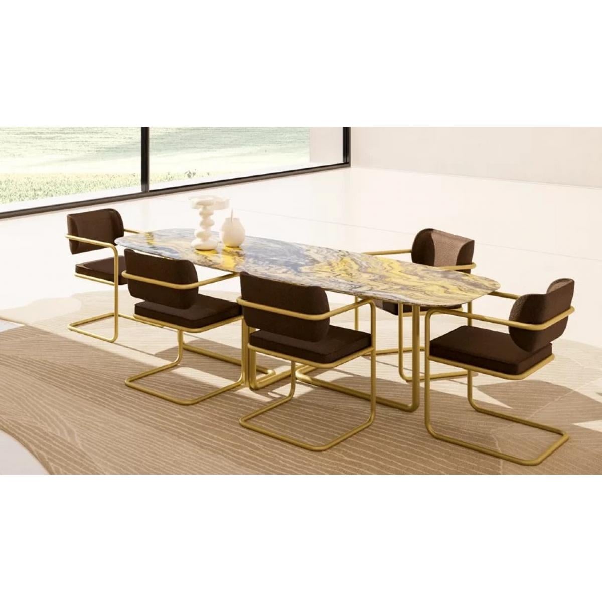 With its high-quality materials, this table guarantees both durability and sophistication. The brass-finished legs, designed in a sleek U-shape, not only provide superior stability but also add a touch of modern artistry. The marble top dining table is perfect for those who appreciate luxury and elegance, making it an ideal choice for upscale homes and apartments. Whether for formal dinner parties or intimate family meals, it combines style and functionality effortlessly. For a complete luxury dining experience, explore our full Luxury Dining Table Collection.
