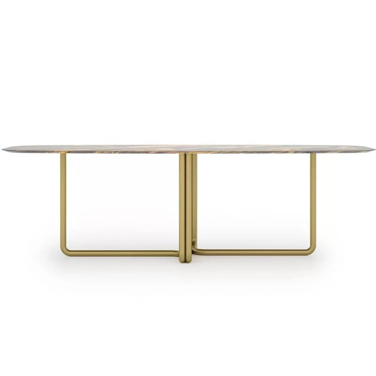 This luxury rectangular marble top dining table with brass finish golden legs epitomizes refined craftsmanship, ideal for luxurious modern living. The striking marble top, with its harmonious blend of light and dark tones, creates a lavish contrast with the sleek, gold-toned brass legs. The table’s elongated, oval shape fosters an inviting, open space, ensuring ample room for guests and creating a welcoming atmosphere. Perfectly balanced, this dining table not only serves as a functional piece but also adds an undeniable focal point to your home’s dining area.
