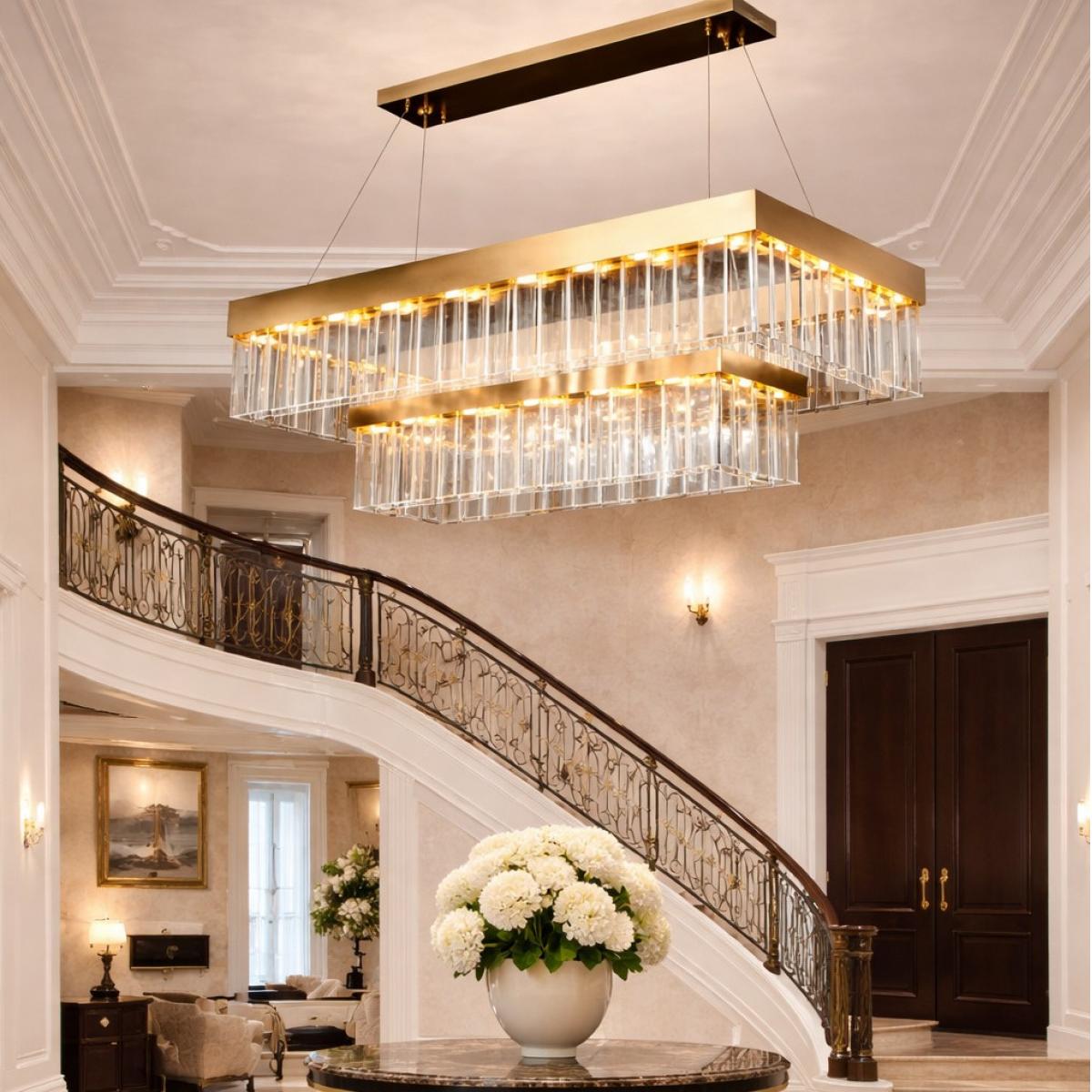Enhance refined interiors further by exploring our curated luxury chandeliers collection. For a harmonious lighting design, explore the elegance of our Gold Round Double Layers Crystal Chandelier, a perfect complement to this rectangular crystal chandelier.