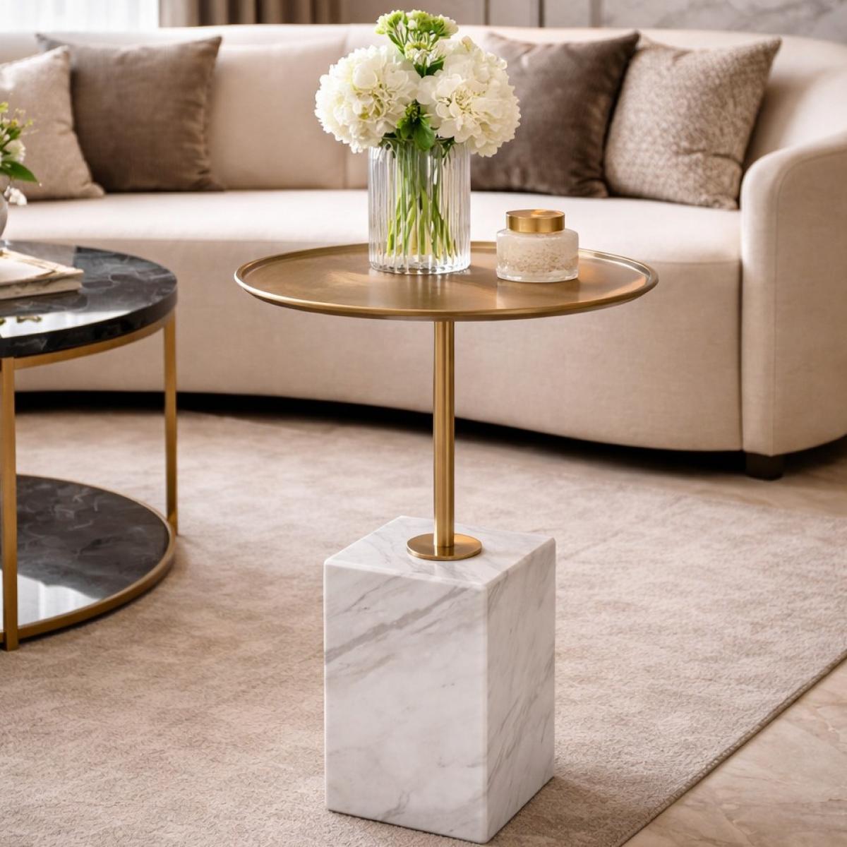 The luxury round Brushed brass finish side table white/black marble base is a refined celebration of minimalism and natural elegance. A circular brushed brass tabletop with delicately raised edges rests on a slender metallic stem, anchored securely into a sculptural marble cube base. The interplay between warm brass and richly veined marble creates timeless contrast, whether you select luminous white Carrara or dramatic black Marquina stone. Each marble base is unique in tone and veining, enhancing the exclusivity of this luxury round Brushed brass finish side table white/black marble base.