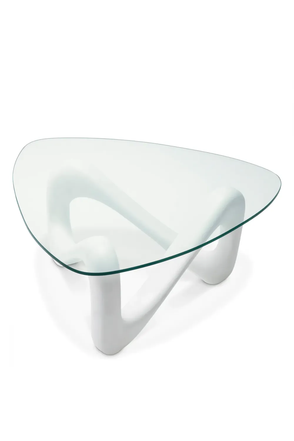 Clear glass top coffee table with white base in a triangular shape, crafted from glass fibre reinforced concrete and tempered glass, delivers architectural stability and visual lightness. Designed as a luxury coffee table, it complements refined European interiors with a modern, sculptural presence.