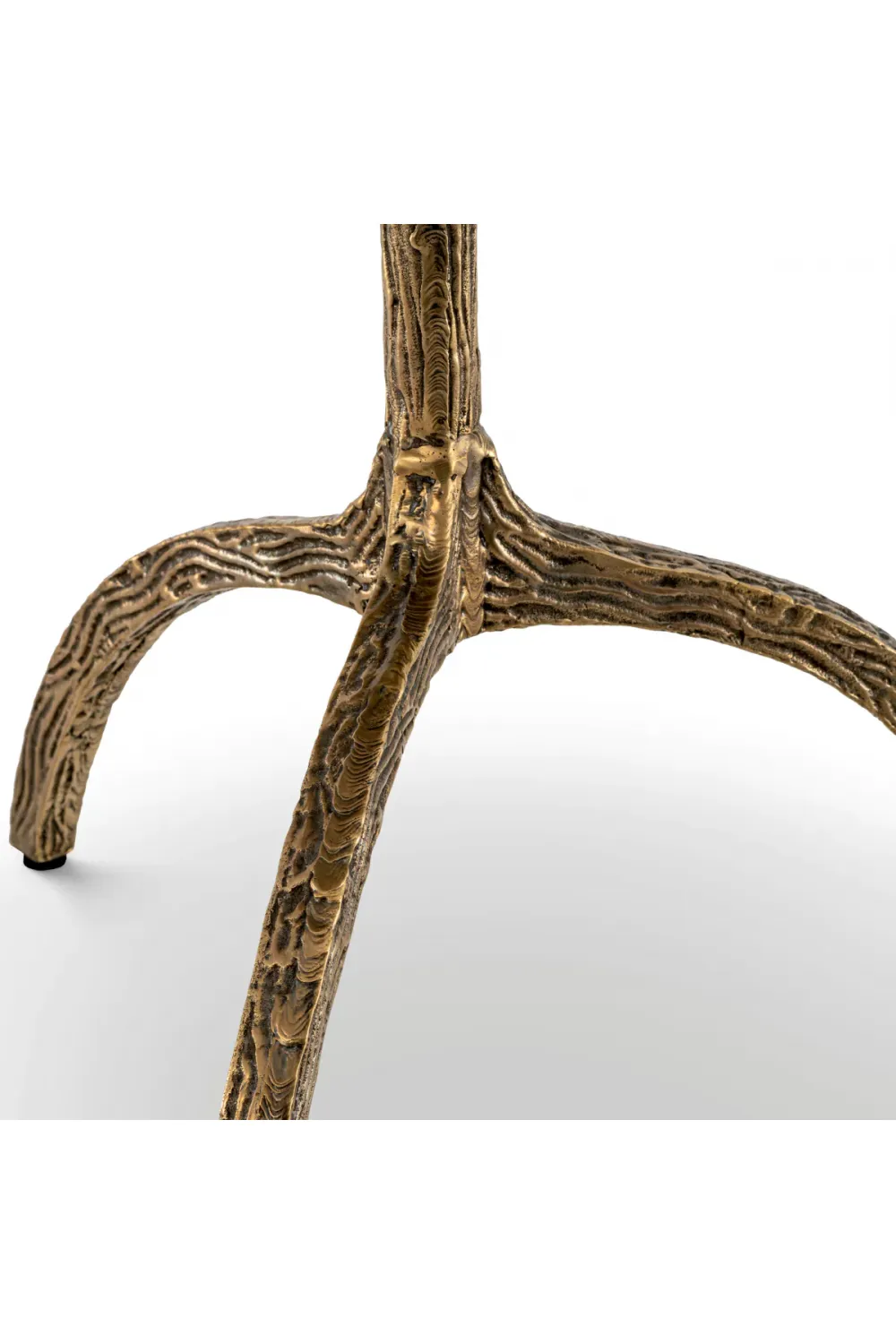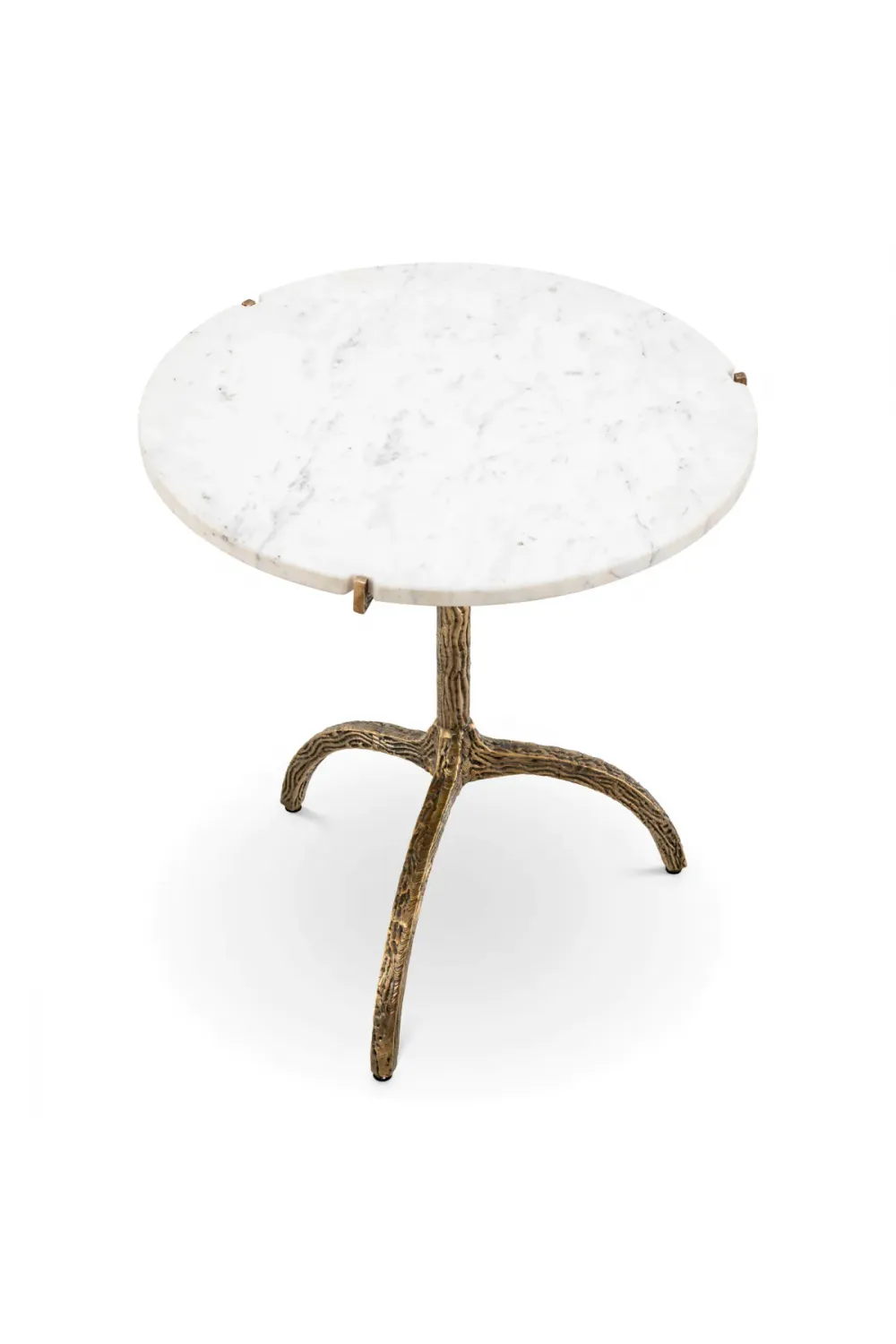 The pristine white marble top introduces natural beauty, with each surface displaying unique veining that ensures no two pieces are ever alike. Smoothly polished and finely edged, the marble rests gracefully atop a richly textured base finished in vintage brass. This artisanal foundation, inspired by organic forms, provides both visual intrigue and exceptional stability, elevating the table beyond conventional design.