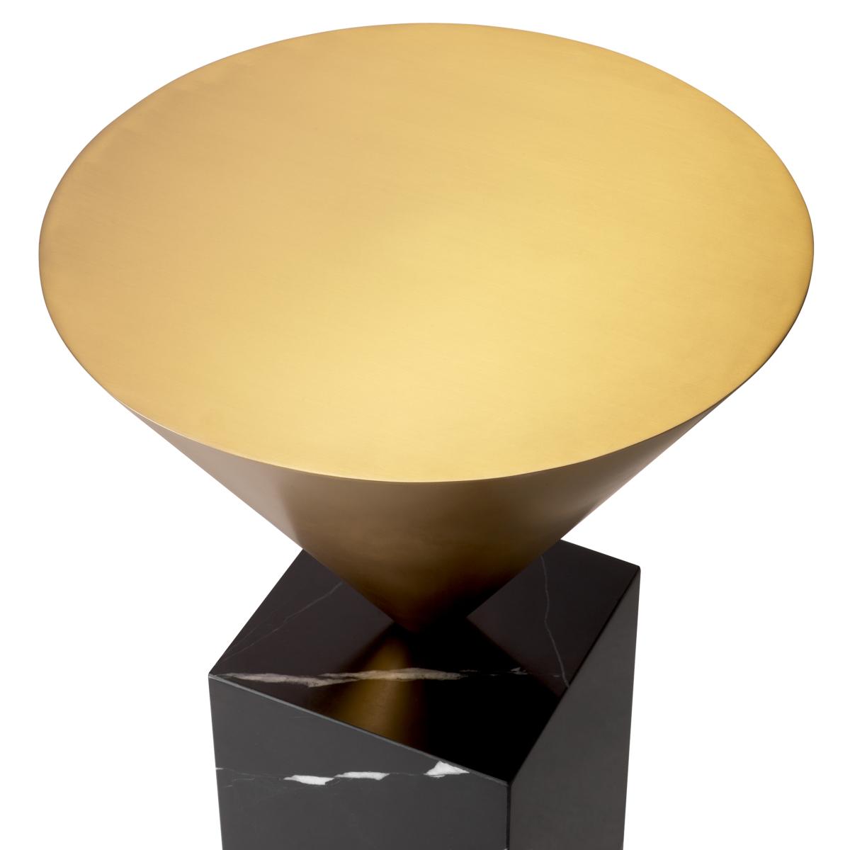 The Luxury round top side table with Brushed brass finish & black marble embodies sculptural precision and material harmony. Its softly brushed brass conical top radiates understated warmth, reflecting ambient light with a satin glow. Anchored by a cubic black marble base enriched with organic white veining, this composition achieves architectural balance and visual depth. The interplay of luminous metal and solid stone transforms the Luxury round top side table with Brushed brass finish & black marble into a statement of modern European craftsmanship, ideal for refined interiors seeking bold elegance.