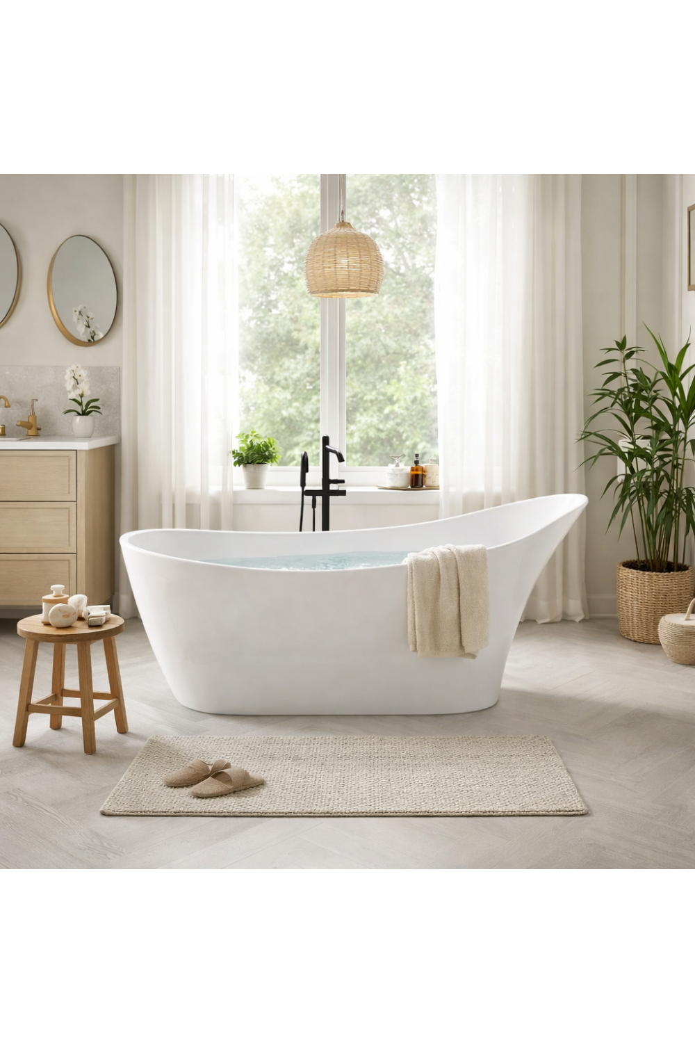 Crafted from premium-quality acrylic, the bath offers a smooth white surface that enhances light reflection while delivering a refined tactile experience. The material provides excellent heat retention, durability, and effortless maintenance, ensuring everyday indulgence without compromise. This thoughtful construction positions the design as a reliable luxury freestanding bathtub for long-term residential use.