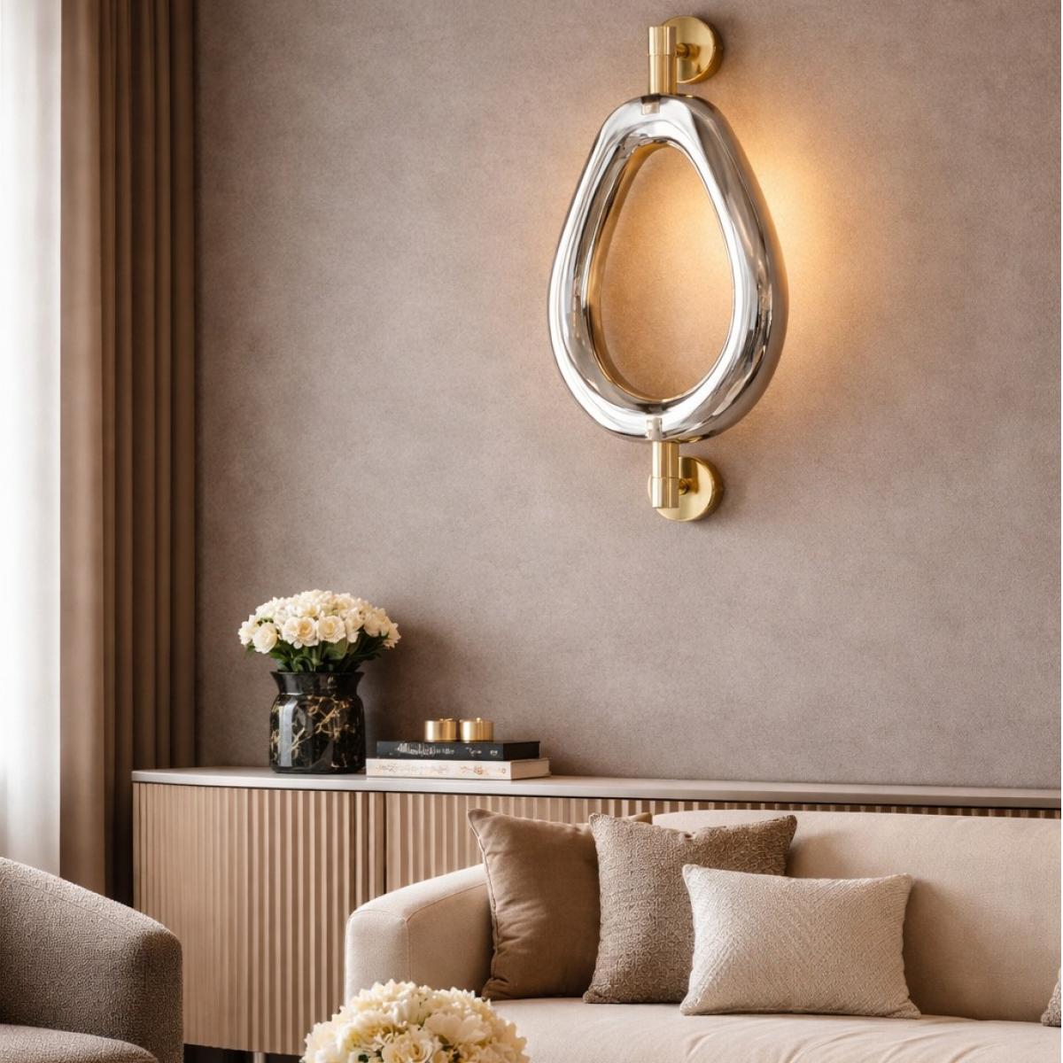The Luxury Sculptural Designer Chrome Ring Wall Lamp with Gold Finish Mounting is a contemporary decorative lighting piece created for interiors that appreciate architectural elegance and refined craftsmanship. Designed with a fluid chrome ring structure and enhanced with elegant gold mounting elements, this wall lamp transforms lighting into an artistic statement. The polished chrome surface reflects light gracefully, producing a soft ambient glow that enhances surrounding décor. Crafted with premium metal construction and integrated lighting, the luxury gold finish sculptural chrome wall lamp with loop creates a floating visual effect that highlights modern interior walls with sophistication and balance.