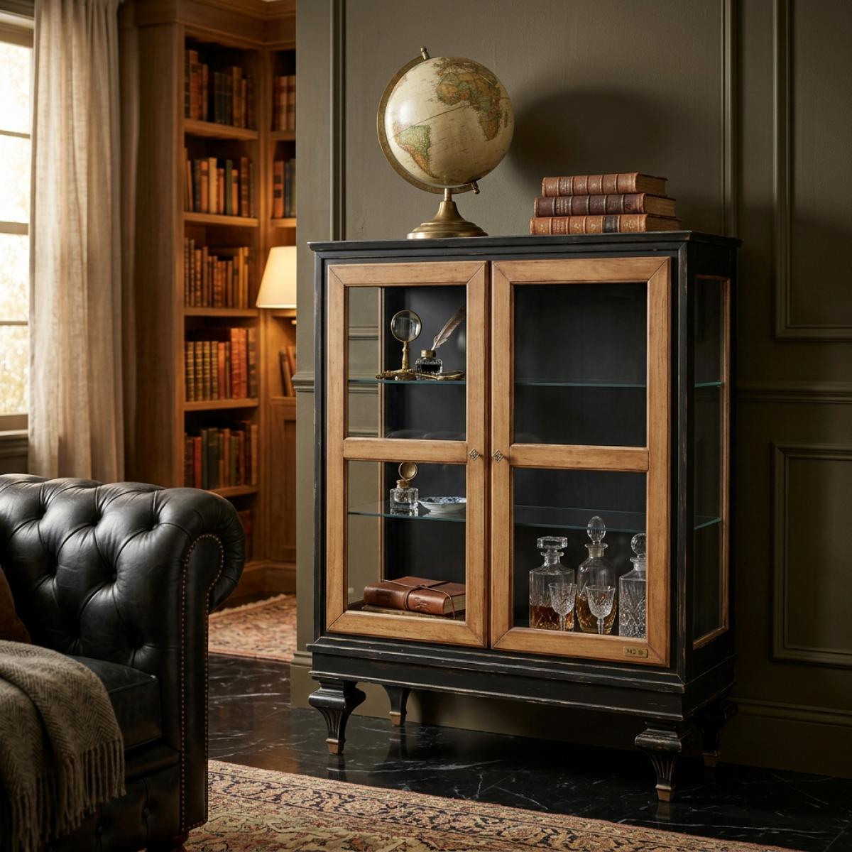 Crafted for both practicality and aesthetic appeal, this baroque display cabinet offers an organized interior with glass shelving, allowing for the elegant display of fine glassware, decorative pieces, or collectibles. The two glass-paneled doors provide clear visibility while maintaining a clean and structured façade. The combination of dark tones and natural wood framing enhances depth, making it a versatile addition to both traditional and modern luxury interiors.