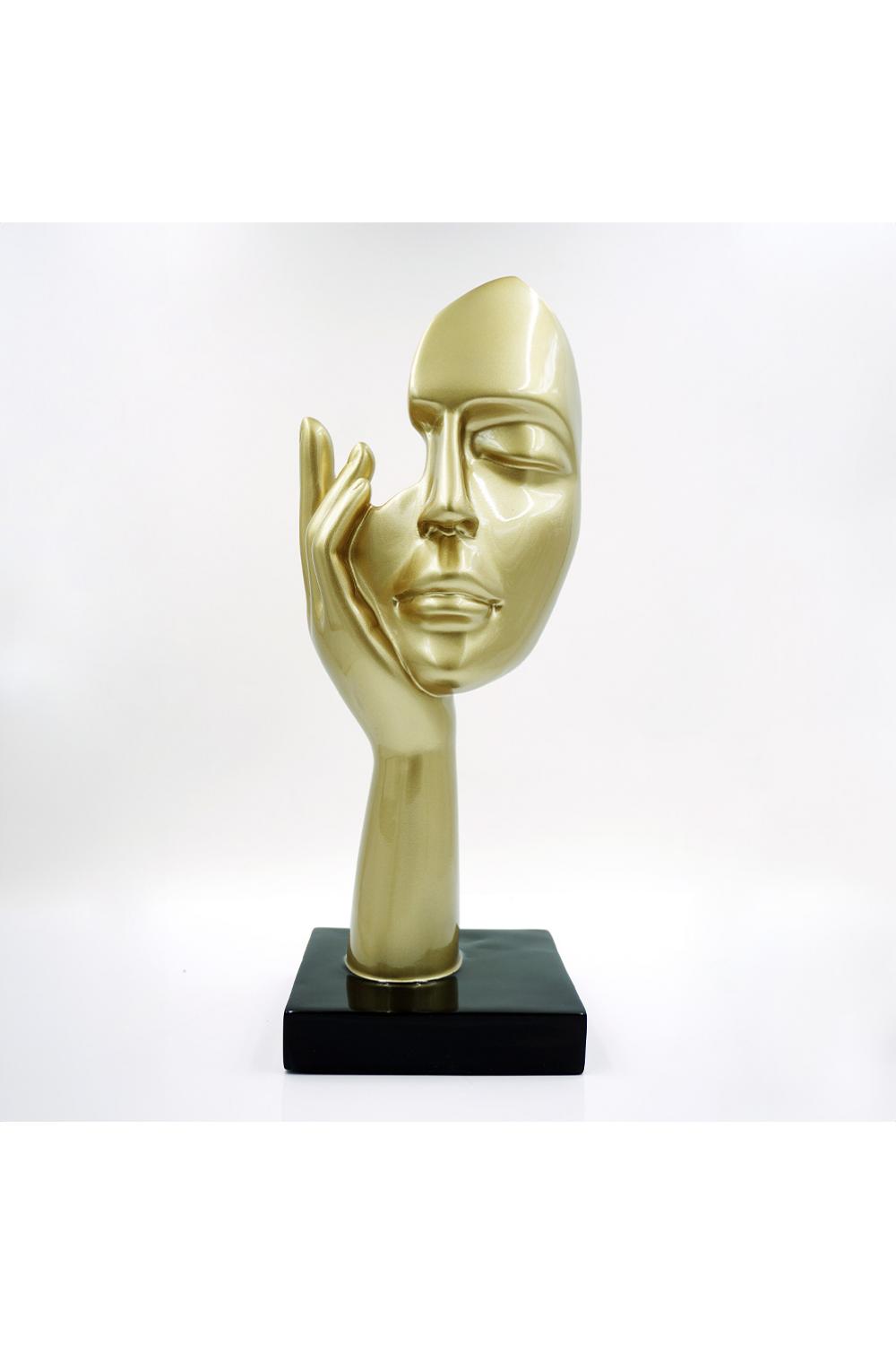 The Art Reflection Sculpture captures the poetic balance between mystery and elegance. Handcrafted from high-quality polyester resin, this 50 cm decorative piece features a stylized face resting gently on a hand — a symbol of thought and creative introspection. The gold finish radiates sophistication and luxury, while the red variant exudes passion and modern flair.