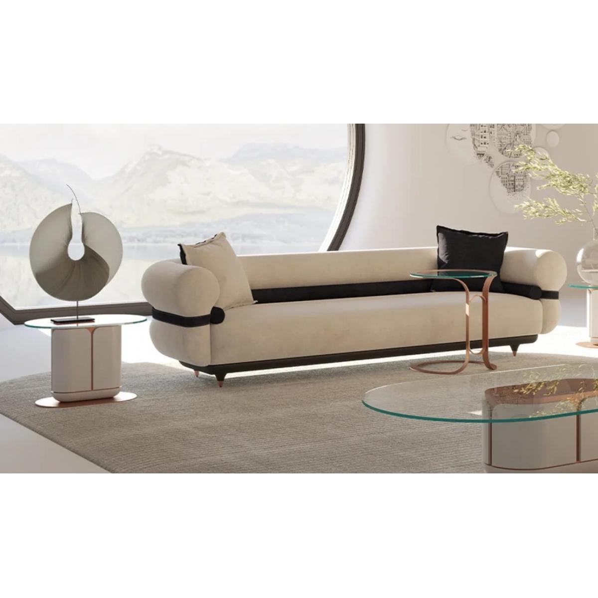 Designed for both residential and hospitality environments, the Luxury Sofa Gray / Black / Copper 260 x 88 x H. 65 cm – Living Room Sofa – Hotel Sofa offers deep seating and ergonomic comfort. This luxury 3 seater sofa provides generous space for relaxation, while the rounded armrests enhance visual softness. The minimalist design ensures versatility, allowing this luxury sofa to complement modern living rooms, hotel lounges, and designer apartments.