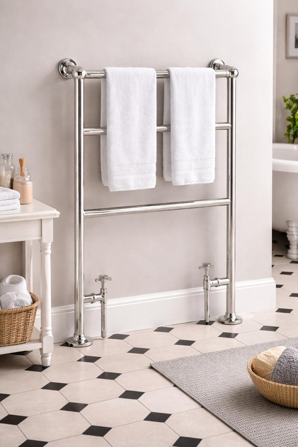• Elegant floor mounted heated towel rail with classic ladder-style design