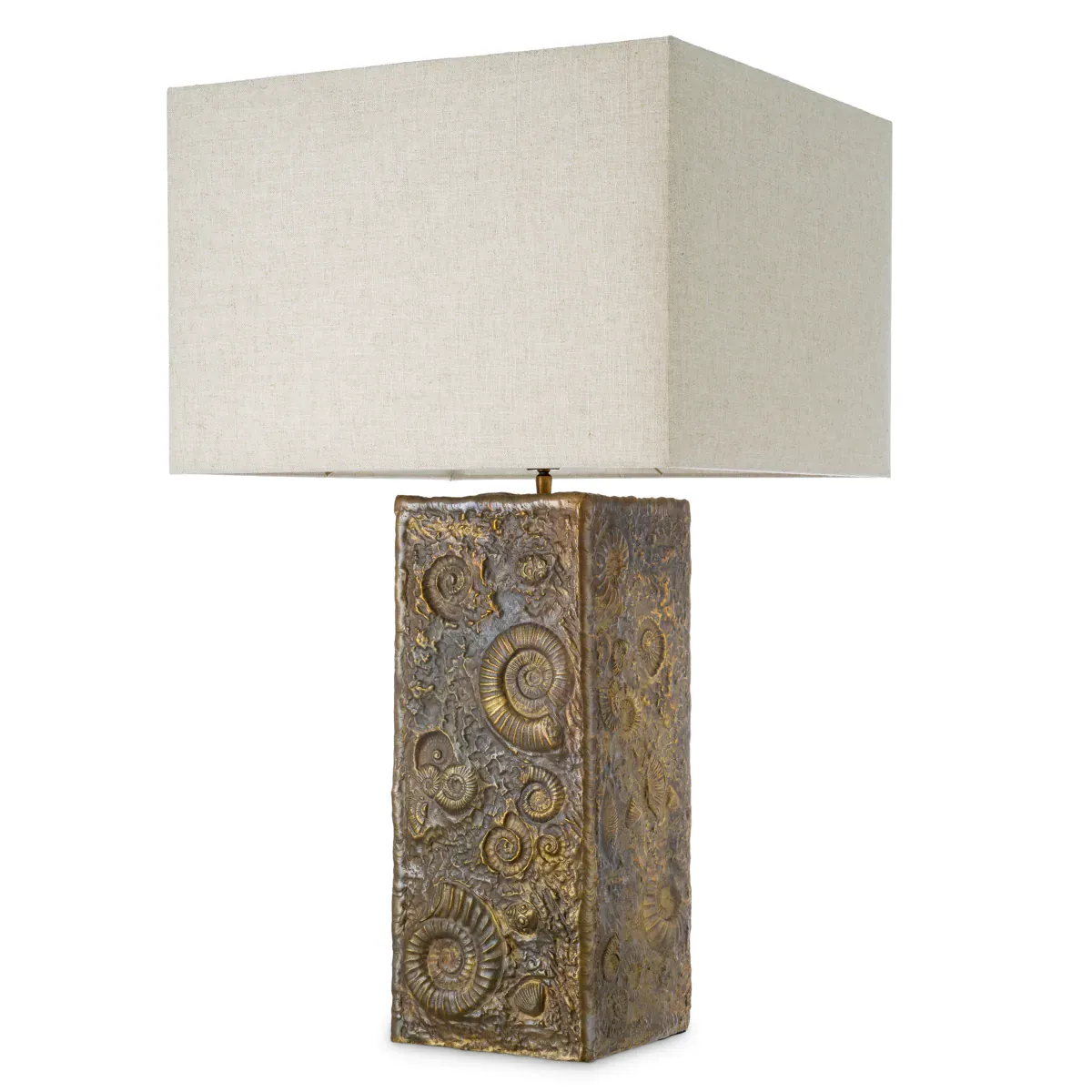Luxury table lamp styling meets an antique-inspired centerpiece look. This ornate embossed metal table lamp is designed to draw the eye with a tall, vertical, rectangular base finished in bronze brown with antique gold-toned highlights. The relief work is the hero: raised embossing forms decorative scroll-like motifs and a central circular spiral medallion, creating a rich, textured surface that feels both classic and decorative. Finished with an aged patina effect and satin-like highlights, the base delivers depth even in soft ambient light. A small top finial at the shade connection adds a refined, traditional touch.