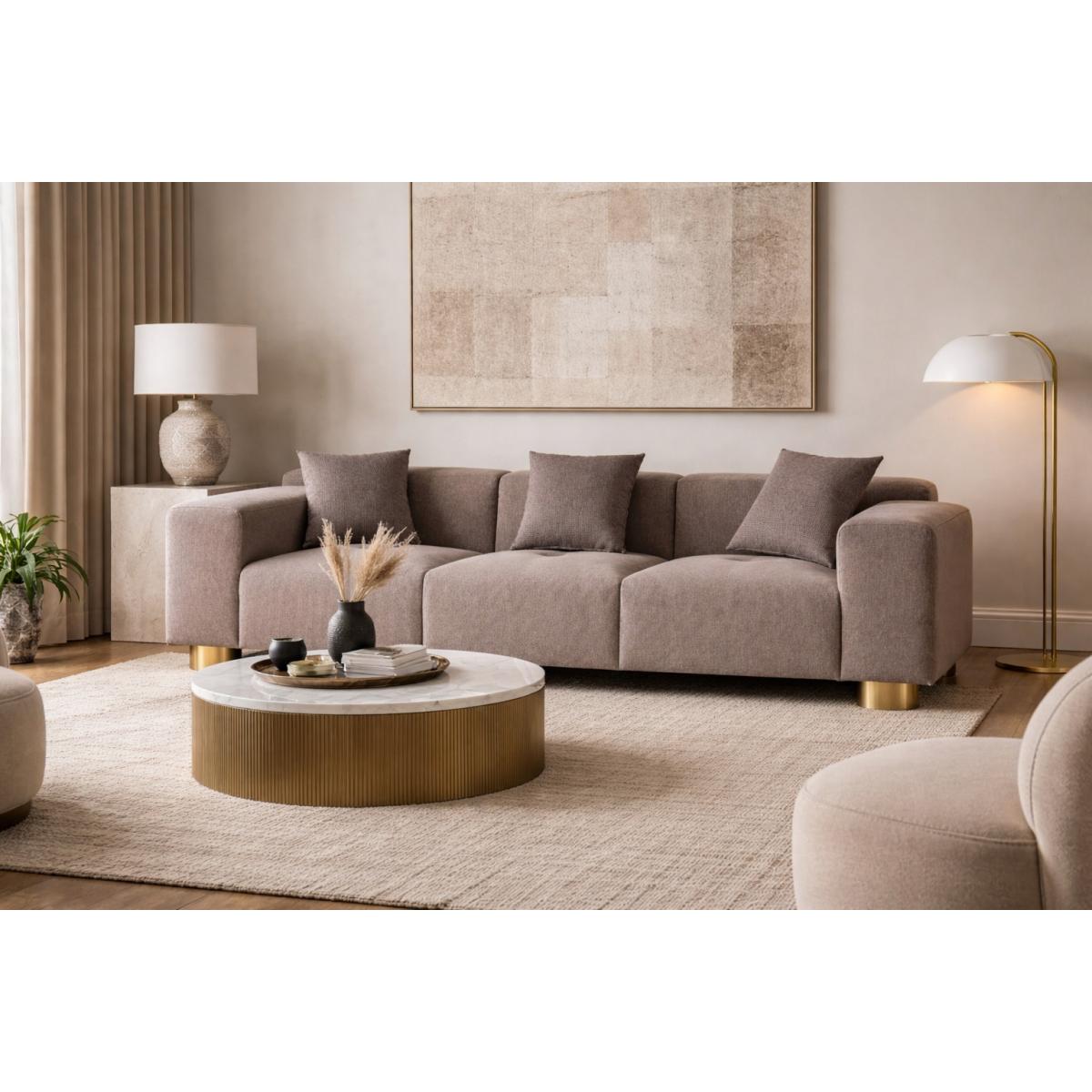 Luxury Modern gray 3 Seater Sofa in Premium Fabric with Antique Brass Base Designer Finish offers deep seating comfort, premium upholstery, and elegant gold detailing. This luxury sofa enhances modern interiors with refined craftsmanship, plush cushions, and a timeless taupe finish ideal for sophisticated living spaces.