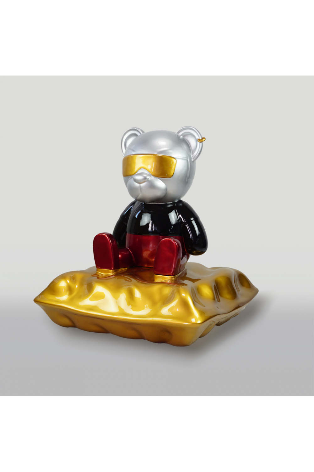 The Luxury Teddy Bear Sculpture – Sitting on Cushion combines modern artistry with whimsical design. Standing 100 cm tall, this handcrafted sculpture is made from durable PWS fiberglass laminate and finished with meticulous hand-painting and high-gloss lacquering. Dressed in a stylish ensemble with golden sunglasses and seated on a radiant metallic cushion, it captures the balance of elegance, humor, and craftsmanship.