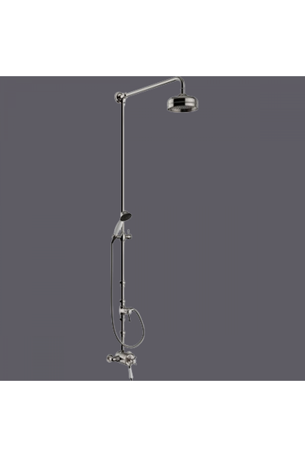 A high-performance exposed thermostatic shower with dual controls for precise flow and temperature, finished in brushed nickel. This nickel plated fixed riser shower system includes a diverter to handset, offering luxury and flexibility for luxury showers in refined bathroom settings.