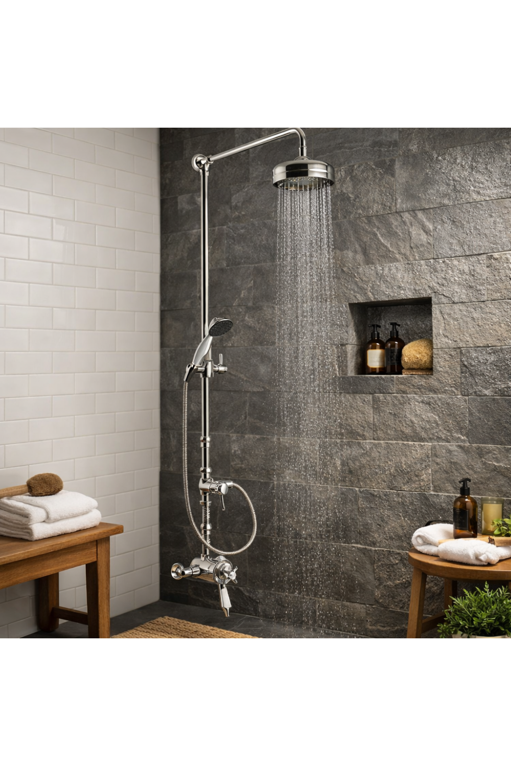 The Luxury Thermostatic Dual Control Shower with Fixed Riser Kit and Diverter to Handset in Brushed Nickel Finish delivers an exceptional combination of beauty, functionality, and performance. Crafted from durable brass and finished in luxurious brushed nickel, this exposed thermostatic shower system ensures consistent temperature control, preventing any sudden fluctuations in water temperature. With its dual controls, you can independently adjust the flow and temperature, while the integrated diverter allows for easy switching between the fixed shower head and the handheld handset. This flexible setup caters to your showering preferences for a luxurious experience every time.