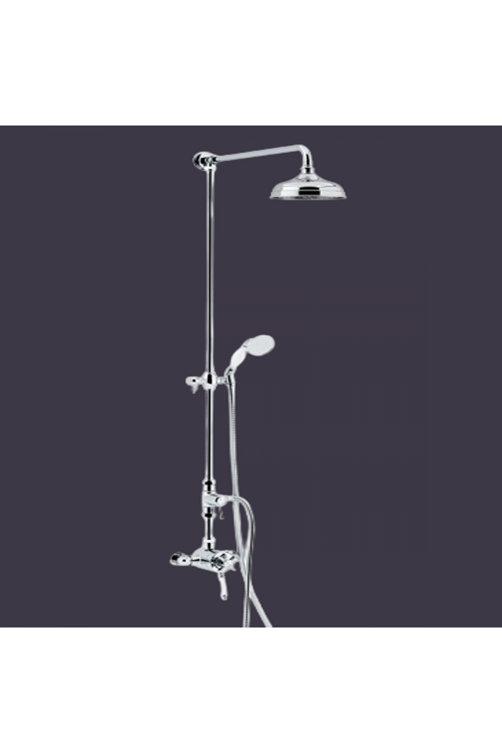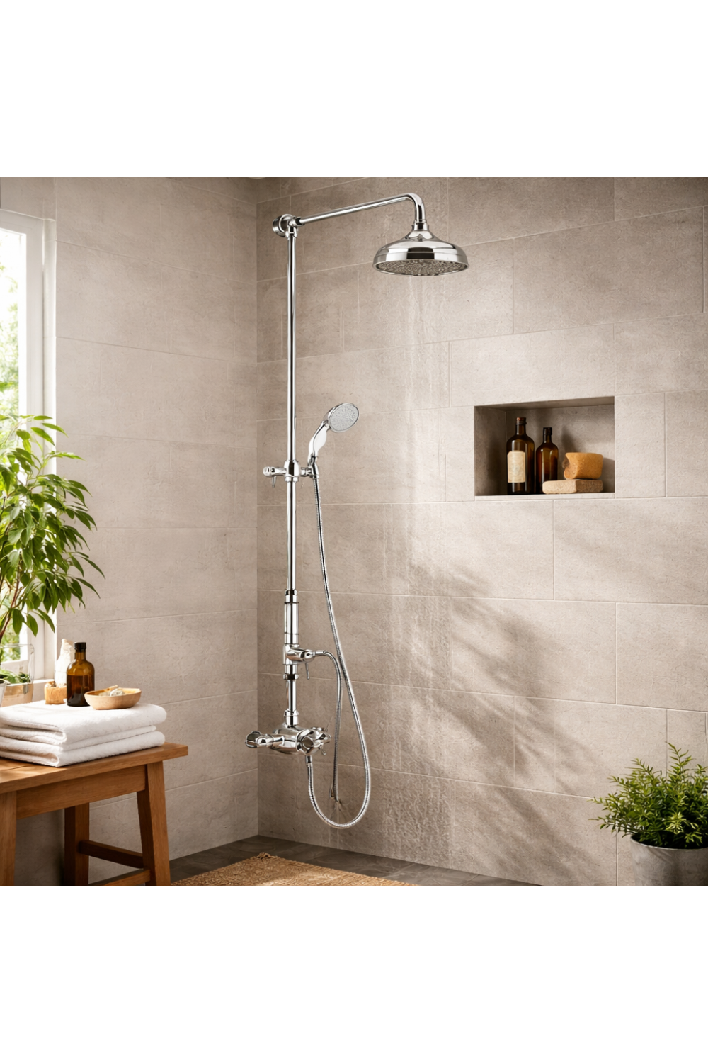 A high-end exposed thermostatic shower in chrome plating, featuring dual controls for precise flow and temperature adjustment. This chrome plated fixed riser shower system includes a diverter to handset, providing flexibility and luxury for luxury showers in modern bathrooms.