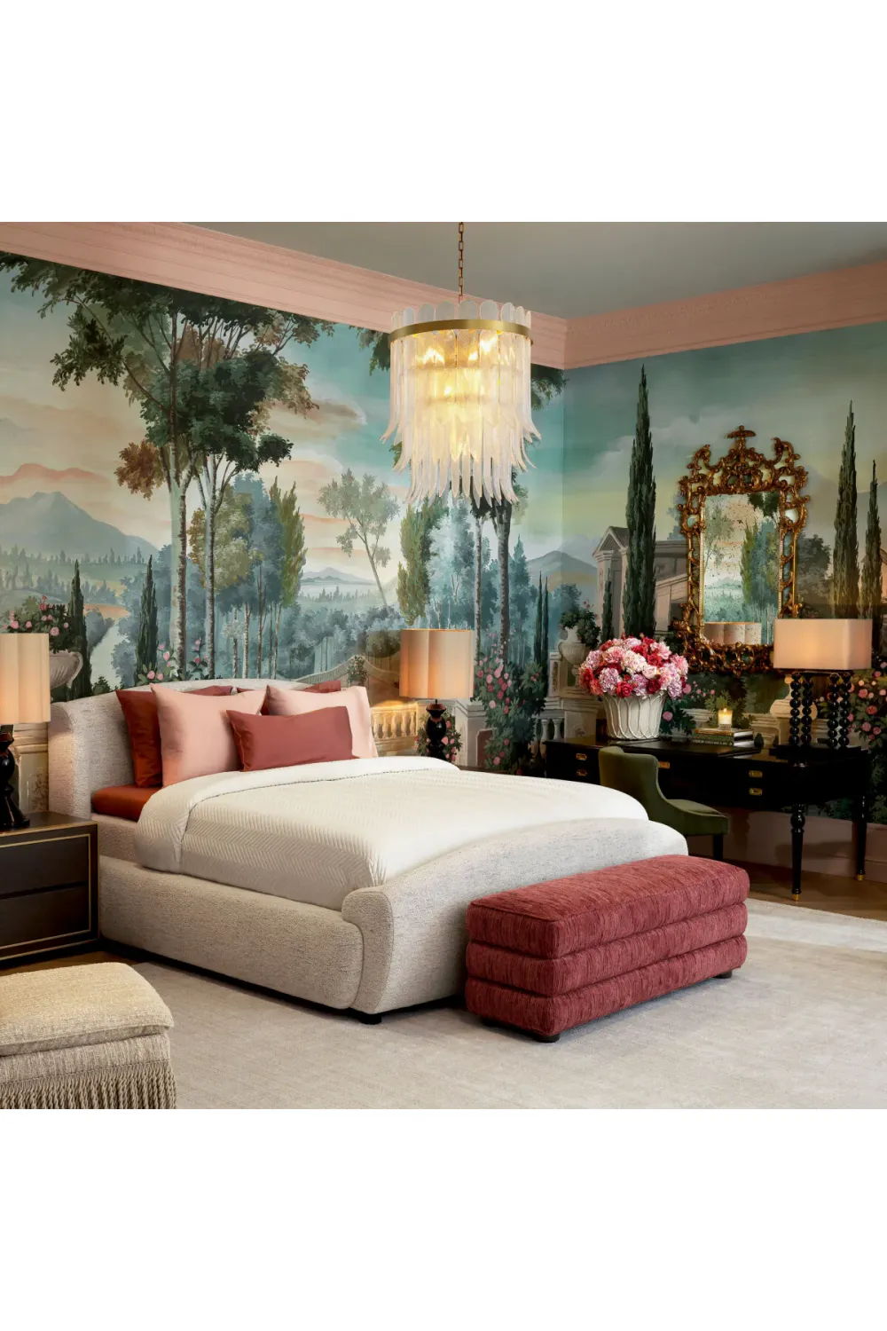 • Upholstered in Torrin green and natural velvet for rich texture and elegance