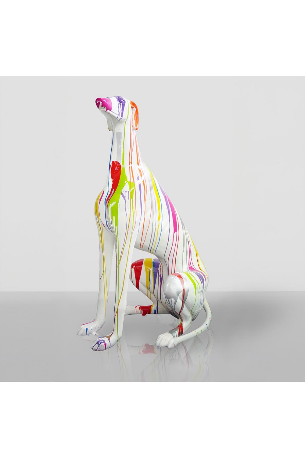 This life-size greyhound sculpture redefines modern artistic décor through its dynamic Trash Art Edition. The sleek silhouette of the greyhound is enhanced with expressive paint splashes, abstract drips, and colorful overlays that transform the piece into a bold contemporary artwork. Measuring 180 cm in height, it offers strong visual presence, ideal for spacious interiors and curated public spaces.
