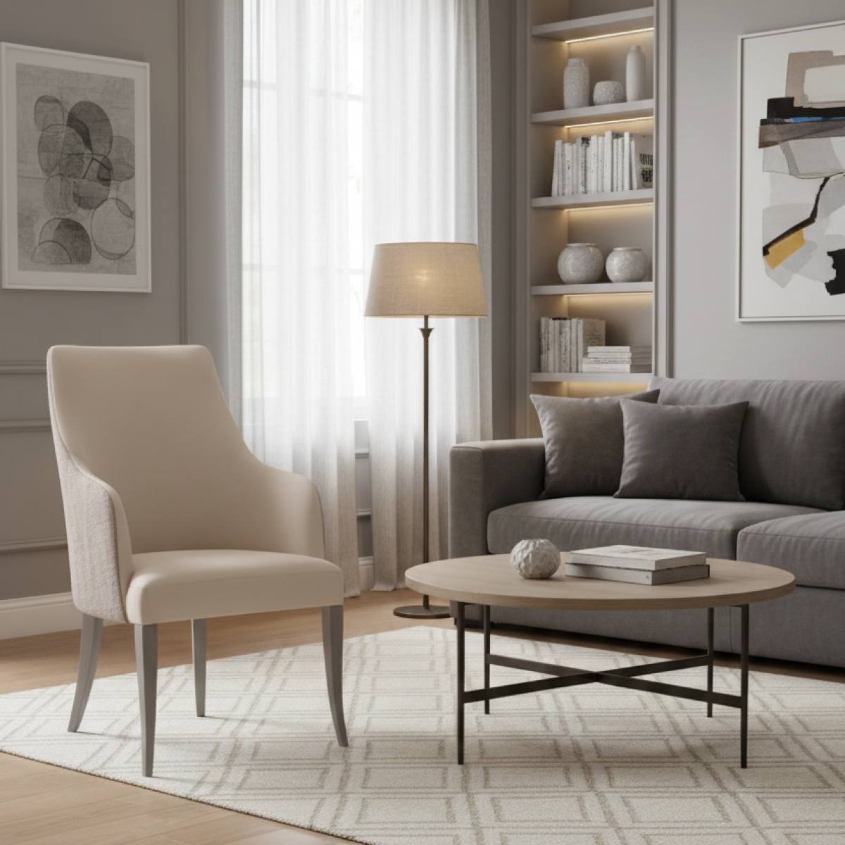 Luxury Upholstered Dining Armchair in Light Beige with Textured Back Panel and Light Greige Legs is a distinguished luxury upholstered dining armchair crafted to elevate sophisticated European interiors. Its gently sculpted wraparound form offers ergonomic support while maintaining a clean and elegant silhouette. The light beige upholstery creates a soft, versatile tone that complements both classic and contemporary dining settings. A contrasting textured back panel adds depth and subtle visual interest, while the light greige wooden legs provide architectural balance. Designed with refined proportions, it stands among premium luxury armchairs for dining room that blend comfort with timeless craftsmanship.