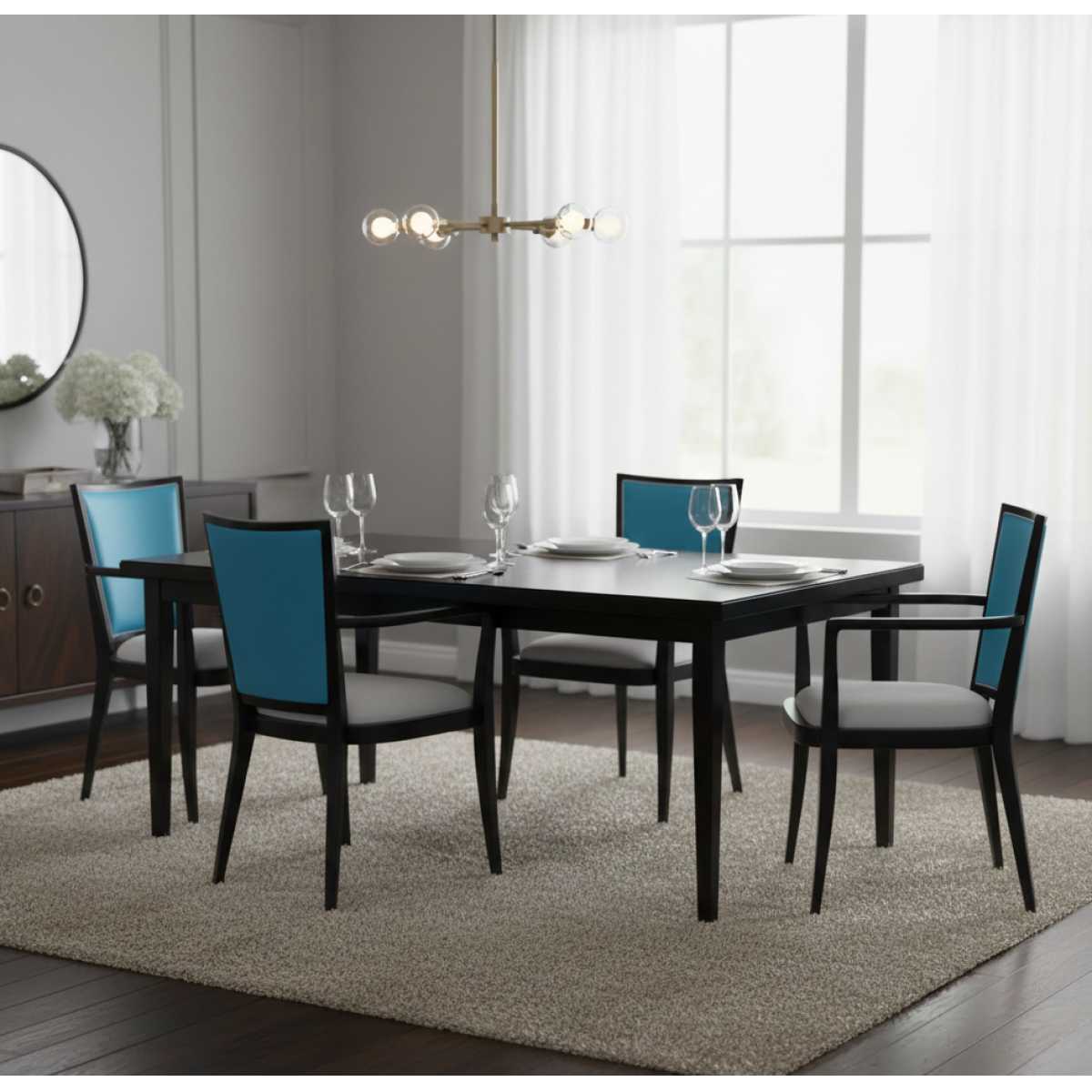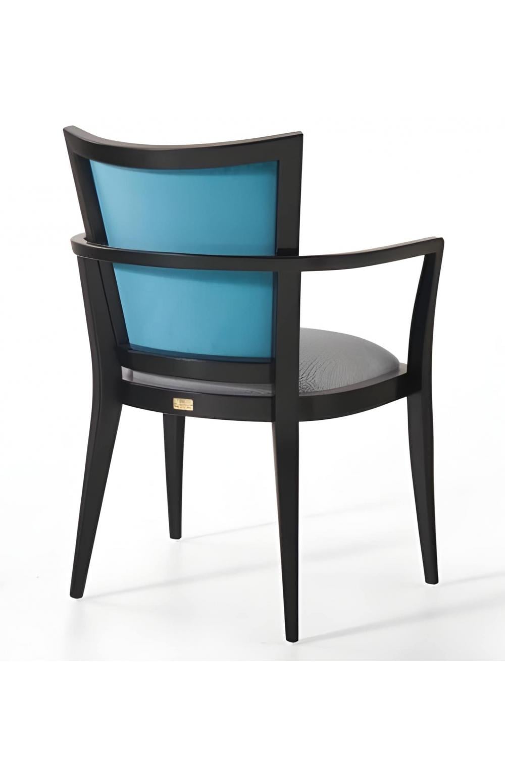 This luxury upholstered dining armchair features a luxurious turquoise silk backrest and a polished black wood frame. Ideal for luxury chairs for dining room collections, this chair combines vibrant style with comfort, making it a standout piece in any luxury dining chairs arrangement.