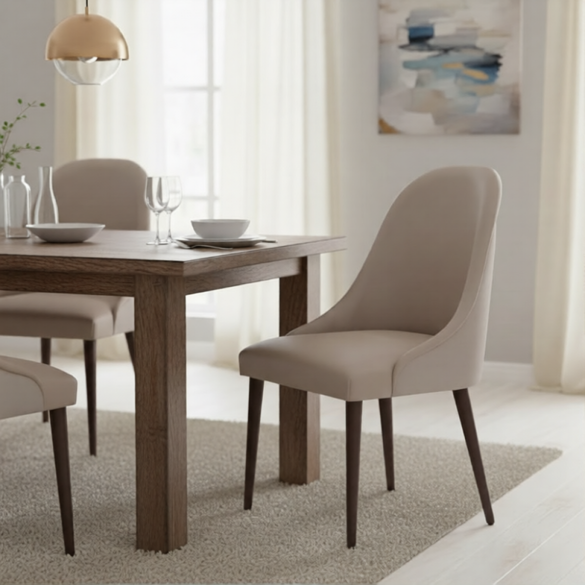 Luxury Upholstered Dining Chair in Champagne Beige with Dark Walnut Tapered Legs reflects contemporary European refinement through its balanced proportions and elongated silhouette. This luxury upholstered dining chair features a softly curved high backrest that provides structured support while maintaining a clean architectural form. The champagne beige upholstery enhances its understated elegance, and the smooth cushioned seat ensures stable comfort for extended dining experiences. Dark walnut tapered legs introduce a rich visual contrast, grounding the light upholstery with warmth and sophistication.