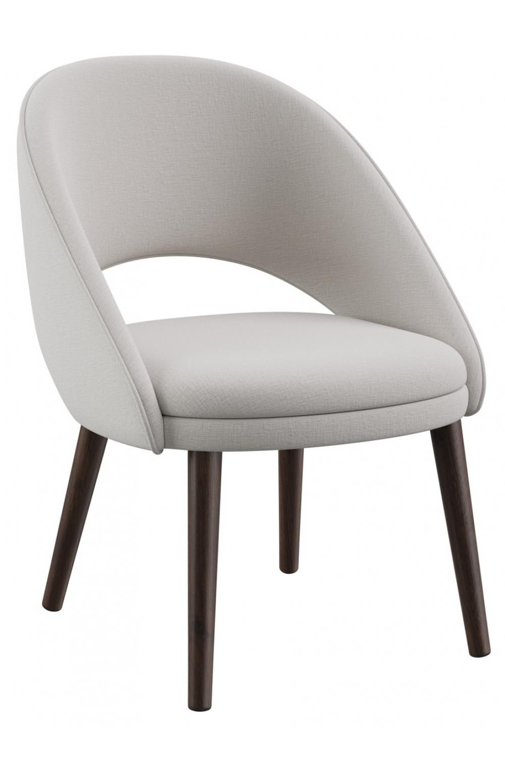 This luxury upholstered low dining chair combines refined style with everyday comfort. Designed with a curved silhouette and open-back detail, it is finished in premium fabric upholstery with FR-certified foam cushioning. Supported by walnut-stained beech wood legs, it delivers durability and sophistication. Available in multiple fabric variants, this versatile chair enhances dining rooms, lounge areas, or contemporary interiors with timeless elegance.