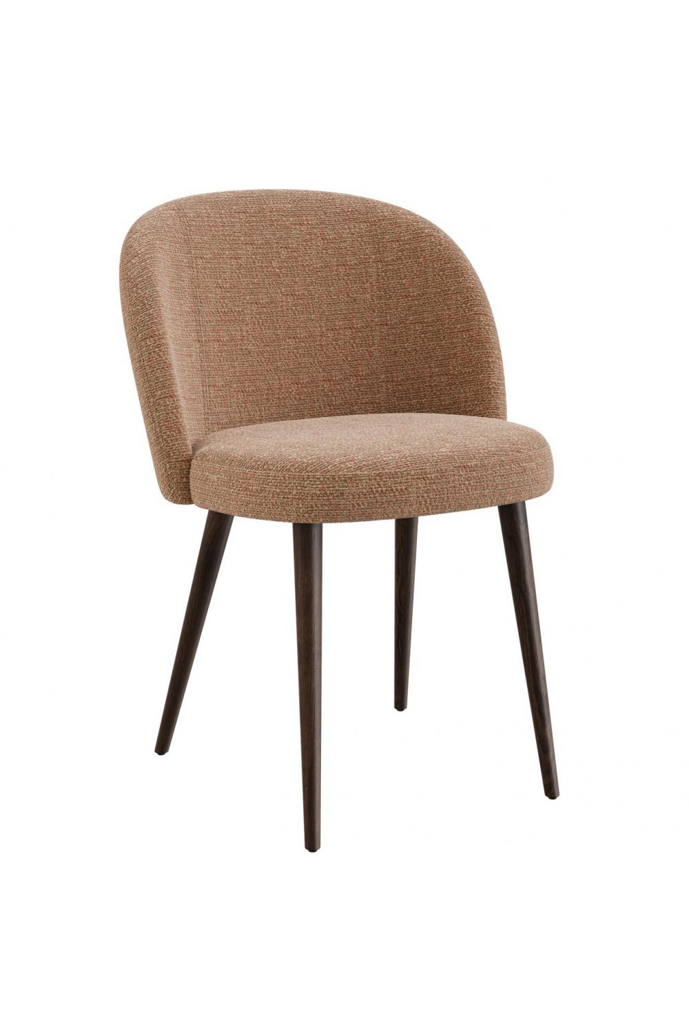 A refined upholstered side chair crafted for modern dining and lounge spaces. The curved back and plush FR foam deliver supportive comfort, while walnut-stained beech legs add natural warmth and durability. Available in multiple fabric and color variants, this versatile piece elevates contemporary interiors with its compact footprint and timeless silhouette—perfect for dining tables, boutique cafés, and stylish home offices.
