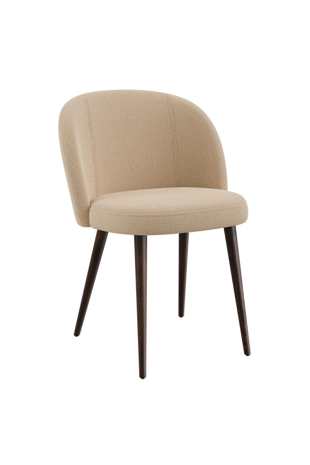 A refined upholstered side chair crafted for modern dining and lounge spaces. The curved back and plush FR foam deliver supportive comfort, while walnut-stained beech legs add natural warmth and durability. Available in multiple fabric and color variants, this versatile piece elevates contemporary interiors with its compact footprint and timeless silhouette—perfect for dining tables, boutique cafés, and stylish home offices.
