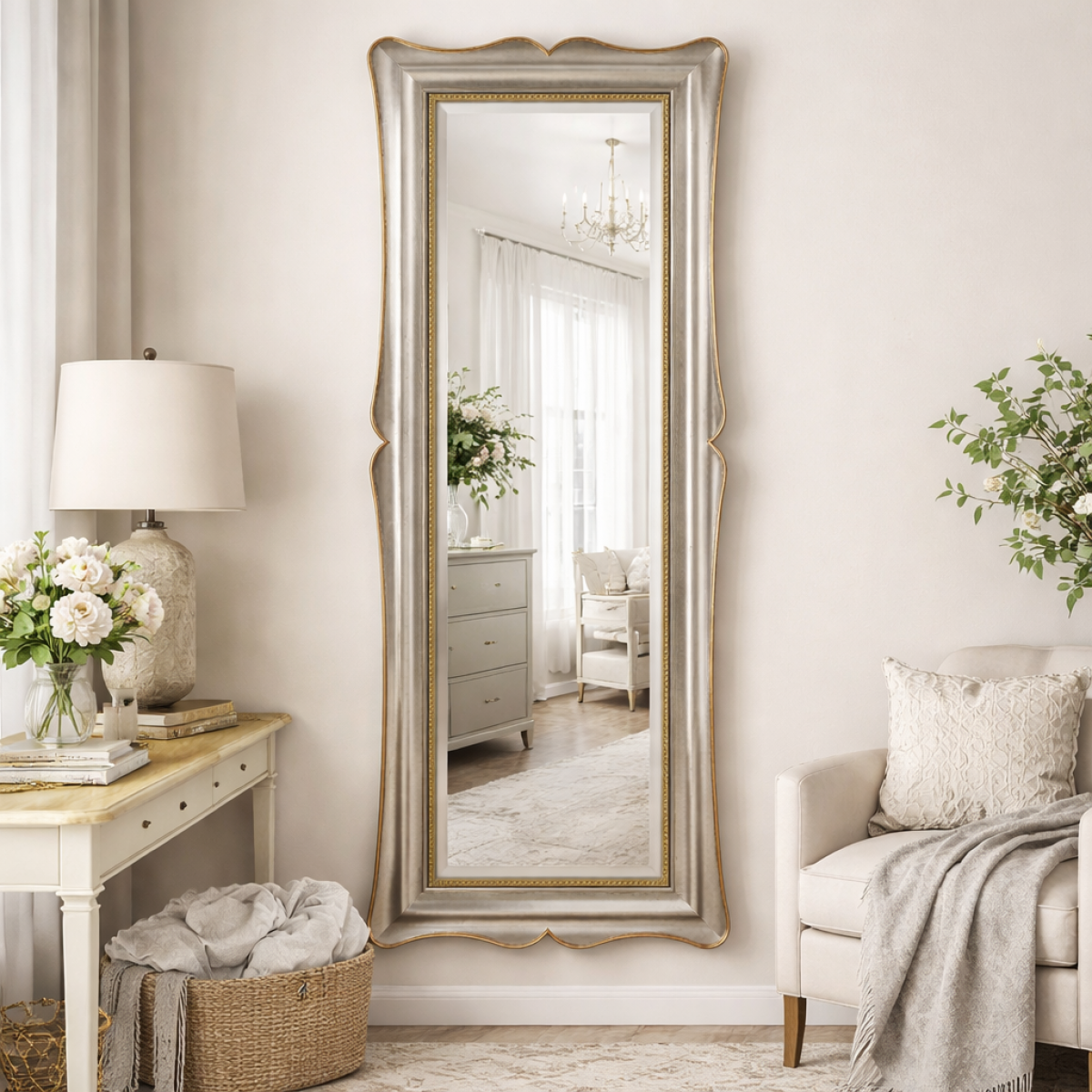 A refined statement from our exclusive collection of luxury baroque mirrors, this sculptural vertical design combines a luminous silver finish with elegant gold detailing. Among premium luxury mirrors for living room, it introduces architectural softness and timeless European sophistication.