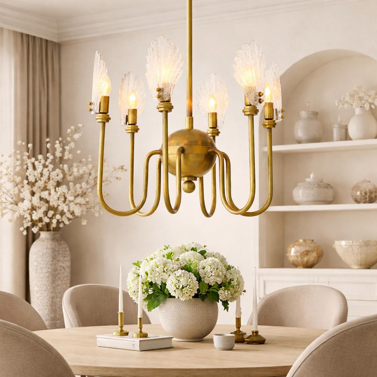 Create luminous, luxury ambience with this luxury Vintage brass finish chandelier. Featuring handmade glass chandelier seashell-style shades and warm filament glow, it’s designed to elevate dining rooms, entryways, and modern glam living spaces.