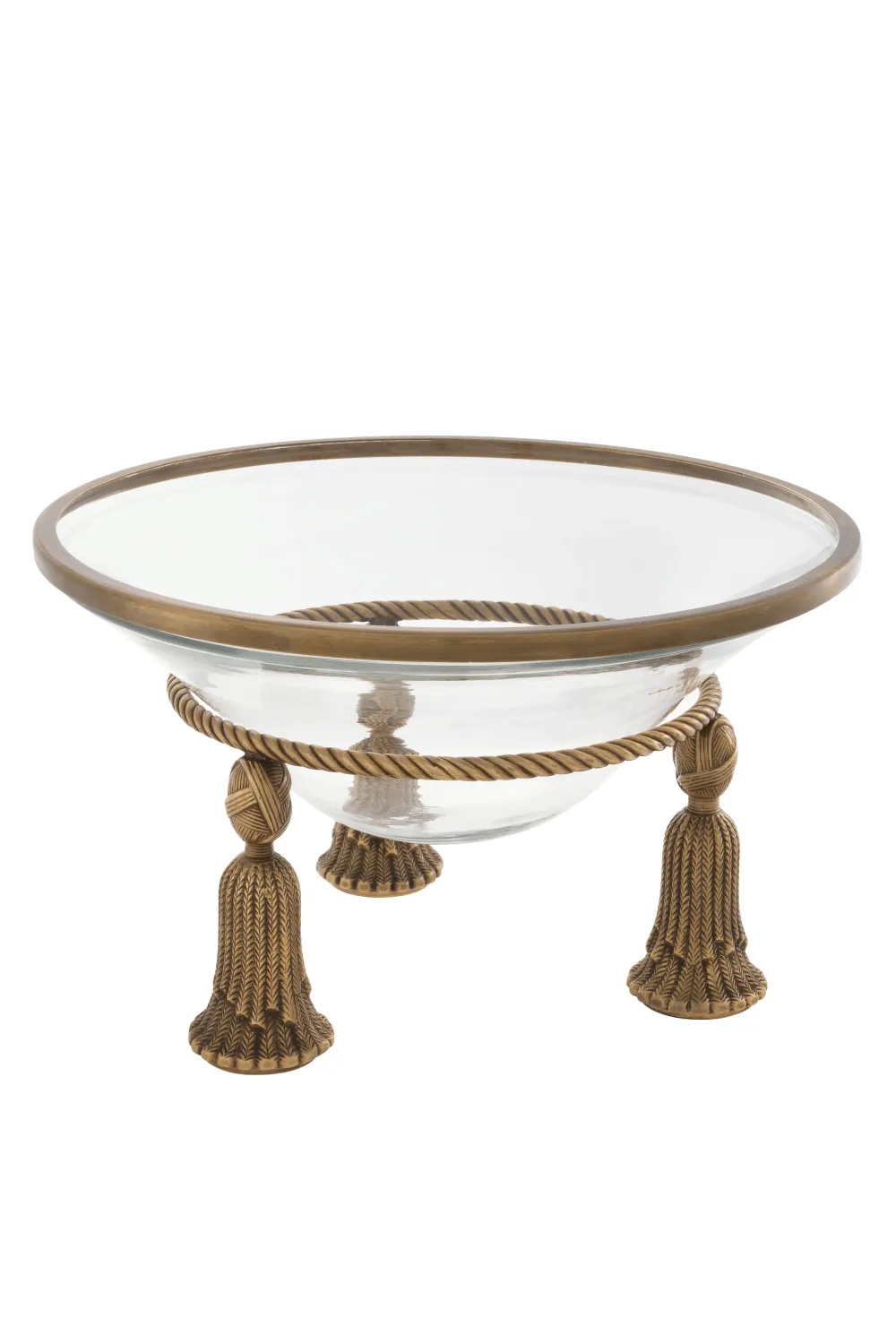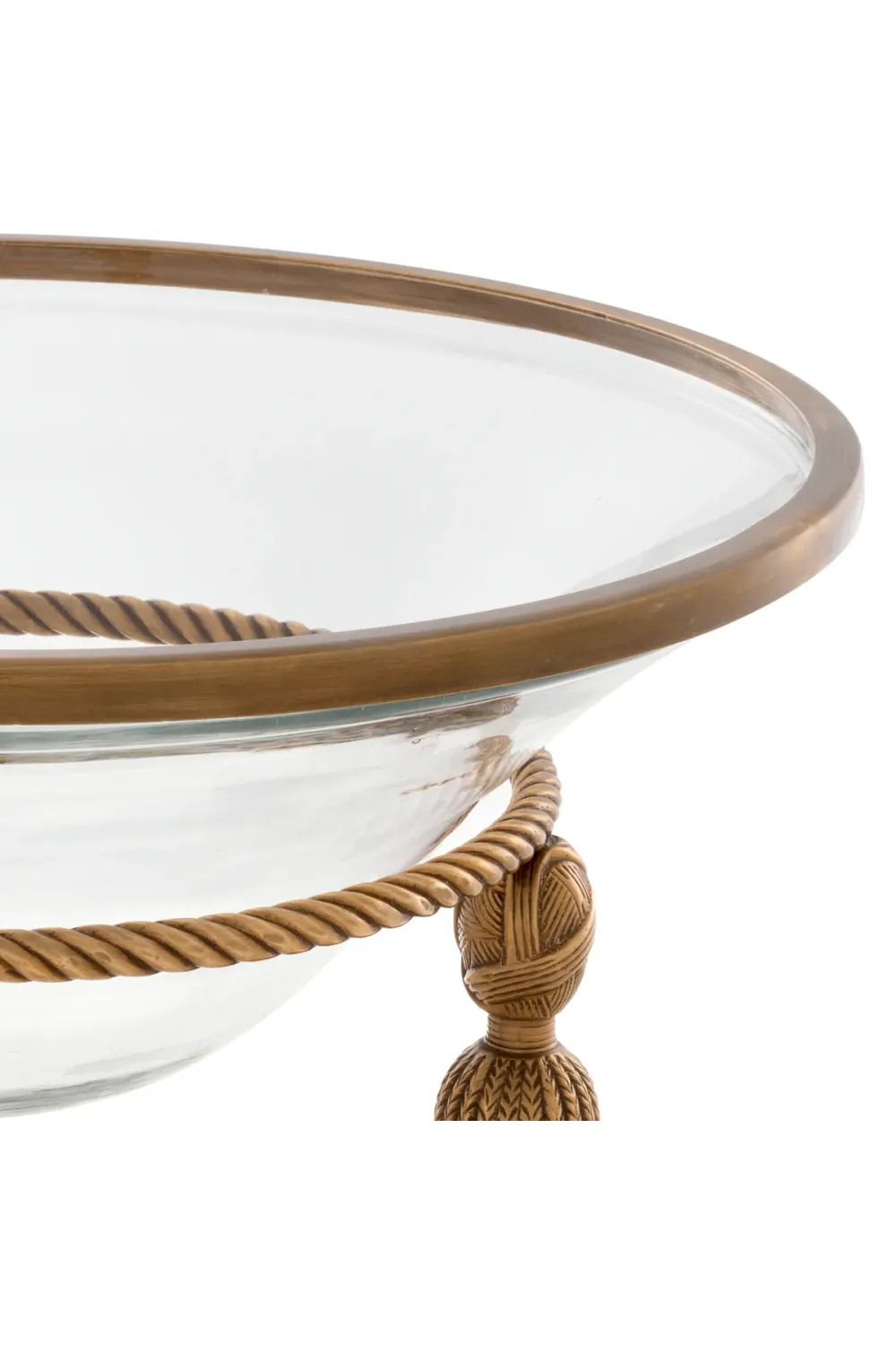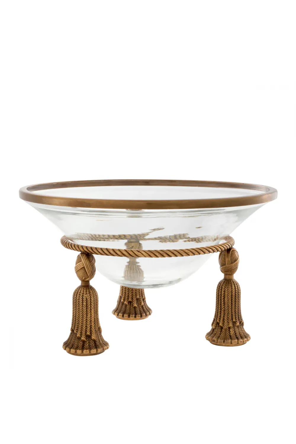 Add refined European elegance to your interior with this luxury designing bowl, crafted in clear glass and finished with a sophisticated vintage brass finish bowl rim. Resting on an ornate brass frame with three tassel-inspired feet, it brings sparkle, structure, and decorative charm to any modern luxury setting.