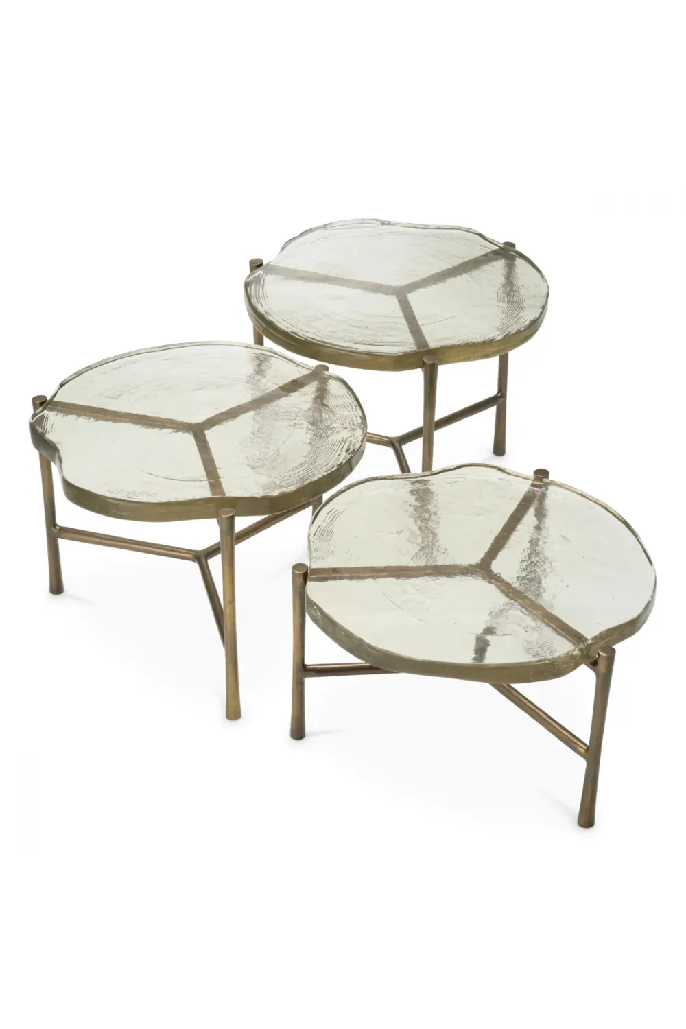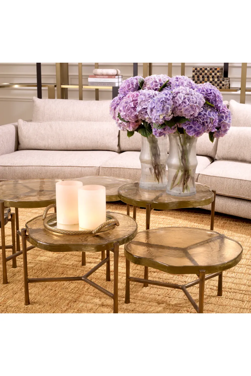 Supported by a warm vintage brass finish, the structure exudes character and sophistication. The surface crafted from handmade glass introduces lightness and visual depth, enhancing the table’s refined presence without overpowering the surrounding décor.