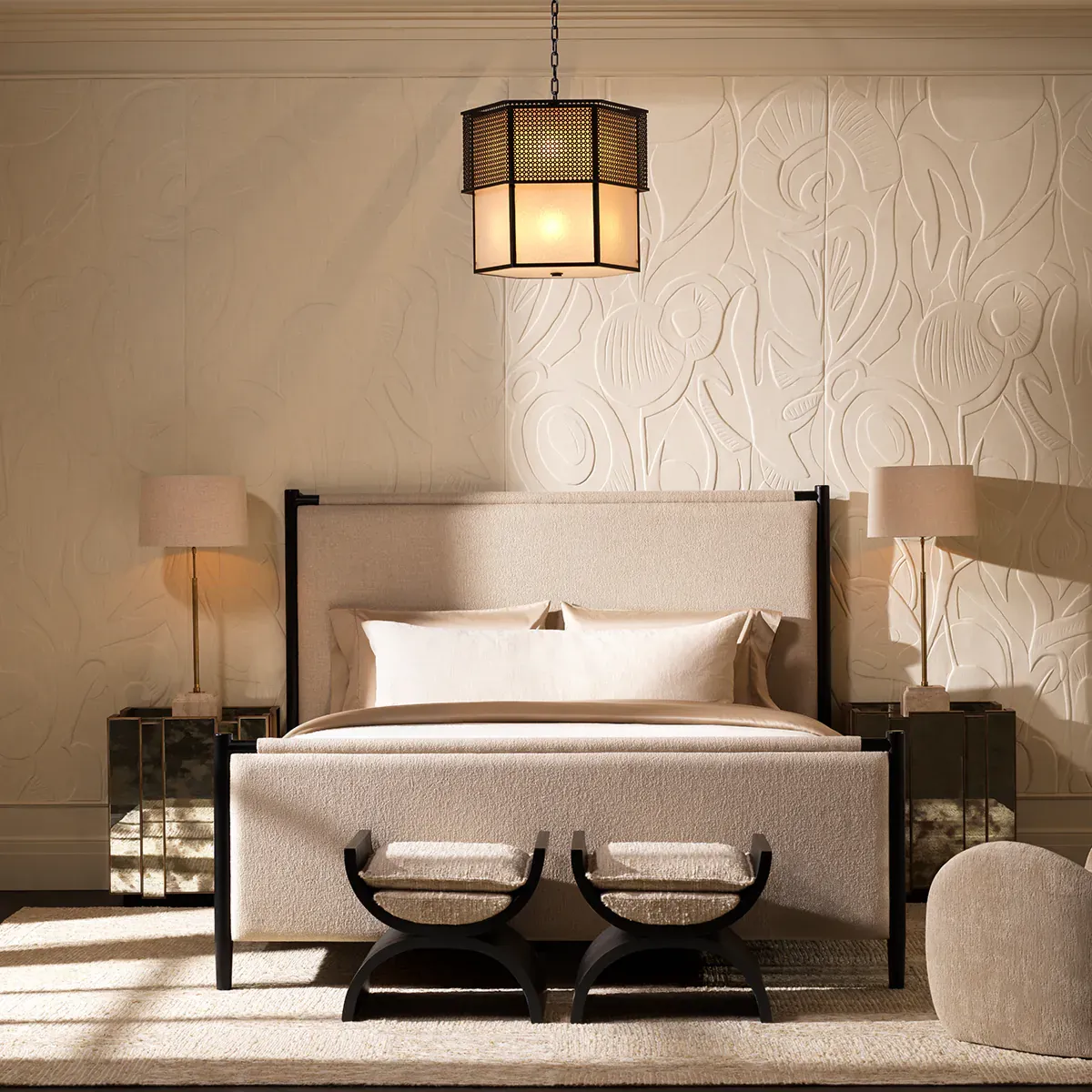 • Fabric drum shade with flat rim silhouette