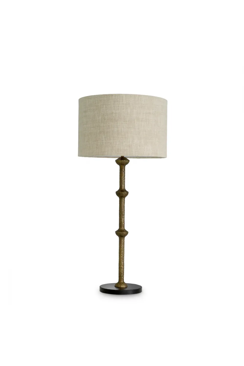 Neutral off-white cylindrical shade softly diffuses ambient light with understated elegance. Supported by a hand-cast stand finished in vintage brass. Designed with a slender vertical profile reaching 85 cm in height. A sculptural luxury table lamp crafted for refined living and bedroom spaces. Echoing the elegance of a Table lamp with off white shade for cohesive interiors. A timeless luxury table lamp balancing artisanal detail and functional illumination.