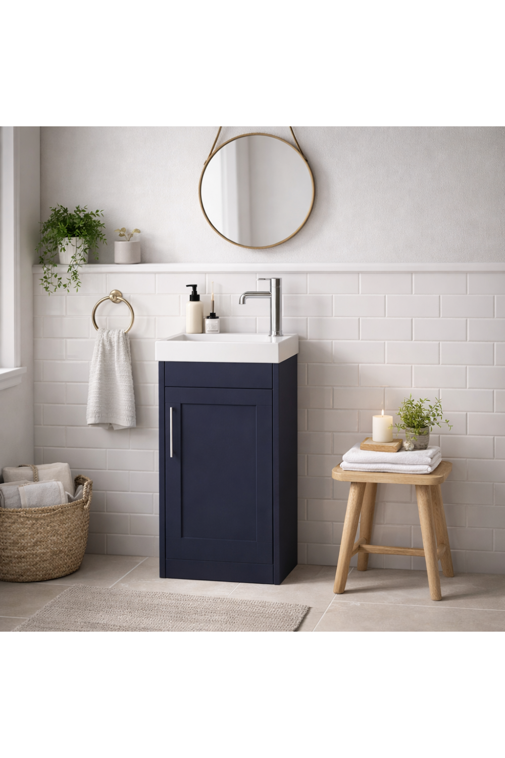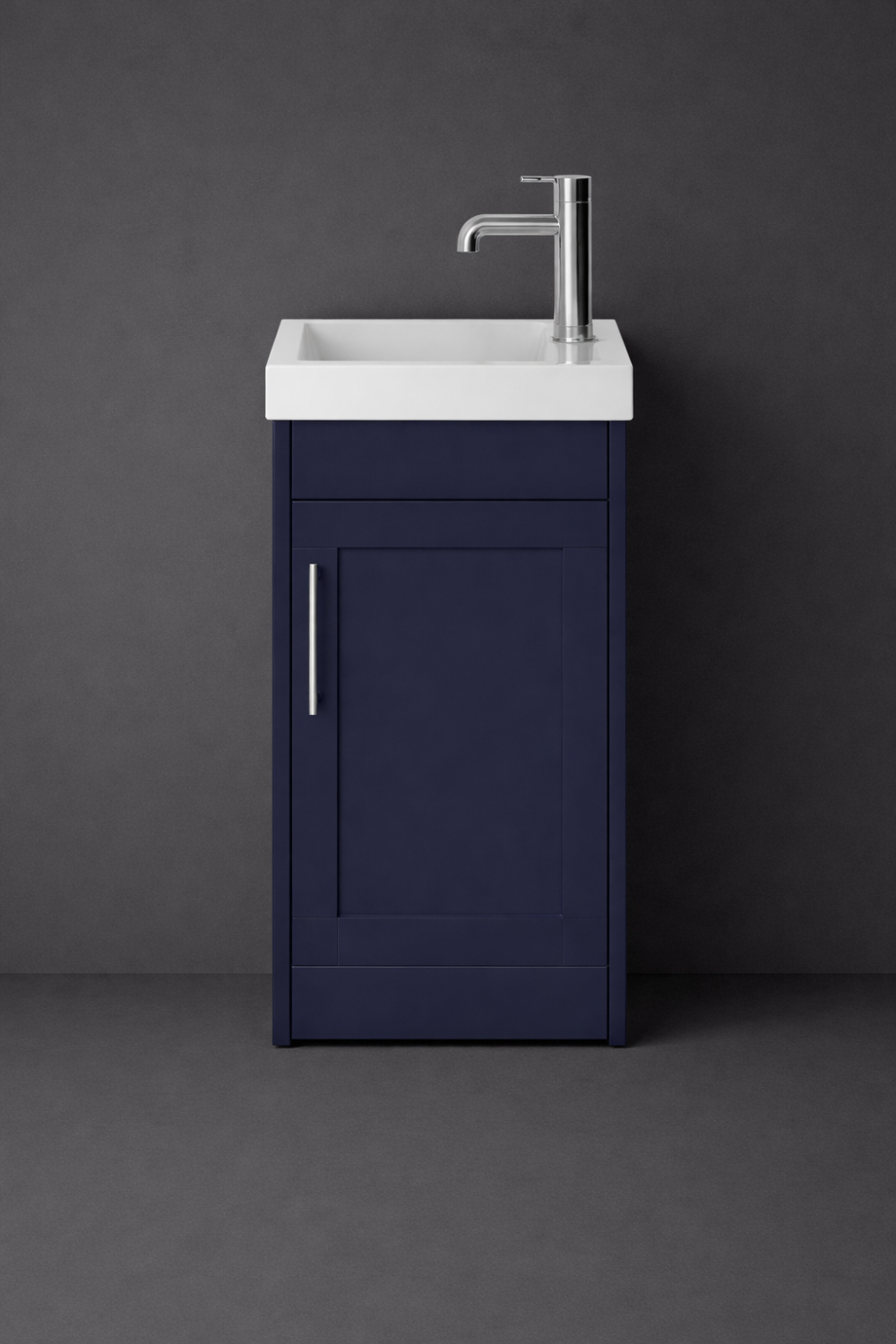 Elegant and space-saving, this wall hung single door cloakroom unit is crafted for compact luxury interiors. Finished in rich Midnight Blue, this designer cloakroom unit delivers refined storage, a floating visual effect, and durable European craftsmanship—ideal for modern cloakrooms and guest bathrooms.