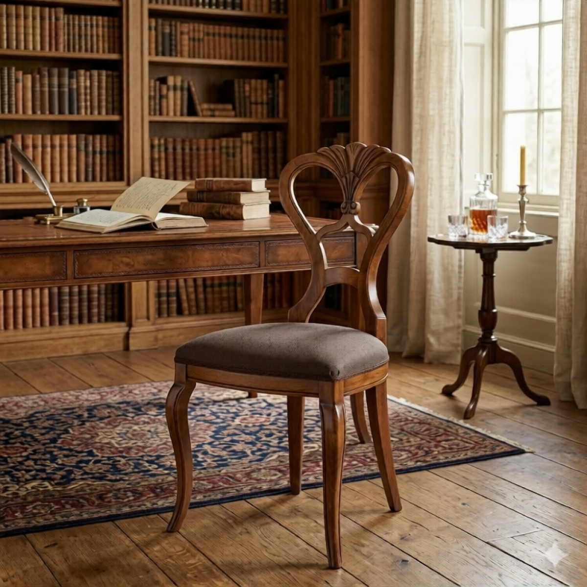 Luxury Walnut Wooden Dining Chair with Sculpted Crown Open Back & Brown Upholstered Seat embodies refined European craftsmanship with elegant carved detailing and graceful proportions. These luxury upholstered dining chairs feature a sculpted crown open-back design that creates visual sophistication while maintaining structural stability. The warm walnut wooden frame highlights the chair’s timeless appeal, while the brown upholstered seat enhances comfort for everyday dining. The gently curved legs and elegant silhouette make these wooden dining chairs ideal for classic dining spaces, luxury residences, and refined hospitality interiors.