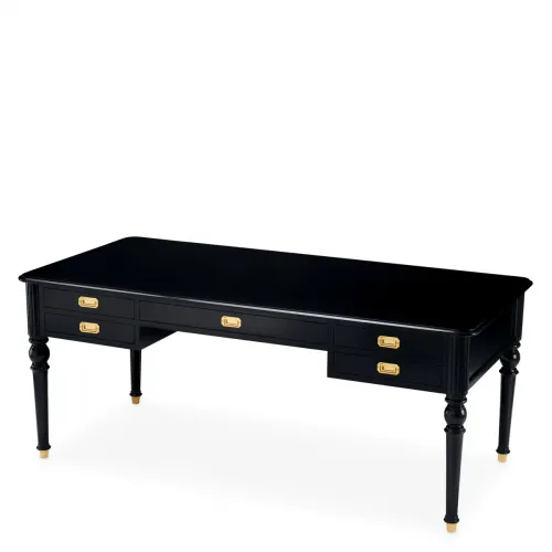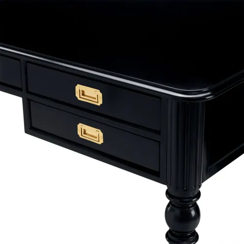 Crafted with exceptional attention to detail, this luxury desk features a waxed black finish that enhances depth and character while highlighting its architectural form. Four slender baluster-shaped legs lend a sense of lightness and classical refinement, echoing traditional craftsmanship. Accented with an antique brass finish, the desk gains warmth and understated opulence. The inclusion of five drawers adds both visual rhythm and practical storage, seamlessly blending function with refined aesthetics.