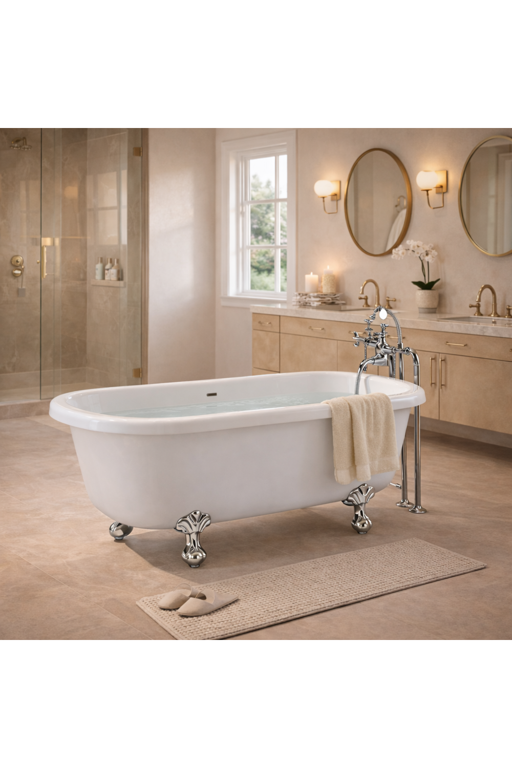 Crafted from high-tensile European acrylic, this luxury freestanding bathtub offers exceptional heat retention, a smooth non-porous surface, and enduring structural integrity. The ergonomic interior supports a deep and immersive soak, holding up to 185 liters for a truly restorative bathing experience. With a zero tap-hole configuration, the design allows complete freedom to pair wall-mounted or floor-standing mixers, enabling a bespoke finish tailored to your interior vision. For a consistent design language across your bathing collection, this piece can be explored alongside our Double Ended Roll Top Bath in White Color Finish range, curated for elegant space-efficient luxury.