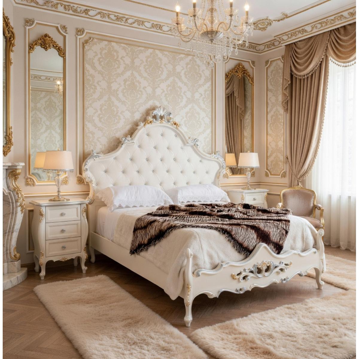 Luxury White Lacquer Baroque Tufted Double Bed with Silver & Gold Carved Frame — 203×210 CM is a work of exceptional decorative artistry, conceived entirely within the European Baroque tradition. The frame is hand-sculpted from premium solid hardwood, structured across a generous 203×210 CM footprint that commands presence with architectural confidence. The headboard rises to a dramatic height of 170 CM, its arched and carved silhouette shaped into sweeping Rococo curves with deeply sculpted acanthus leaf scroll work along the crest and sides. The upholstered panel is finished in ivory white faux leather, meticulously hand-tufted in a deep-button formation with individual crystal rhinestone centres set at each diamond intersection. The outer frame and footboard carry the same carved vocabulary — ornate scrollwork, foliate relief, and a central medallion motif on the footboard — all finished in white lacquer with hand-applied silver leaf highlighting the carved ridges and gold leaf detailing accentuating the crest and footboard centrepiece. The cabriole legs, carved with classical scroll feet, provide both structural integrity and an authentic period silhouette that anchors the entire composition. This designer double bed represents the convergence of historic European decorative arts and the exacting standards of contemporary luxury furniture production.