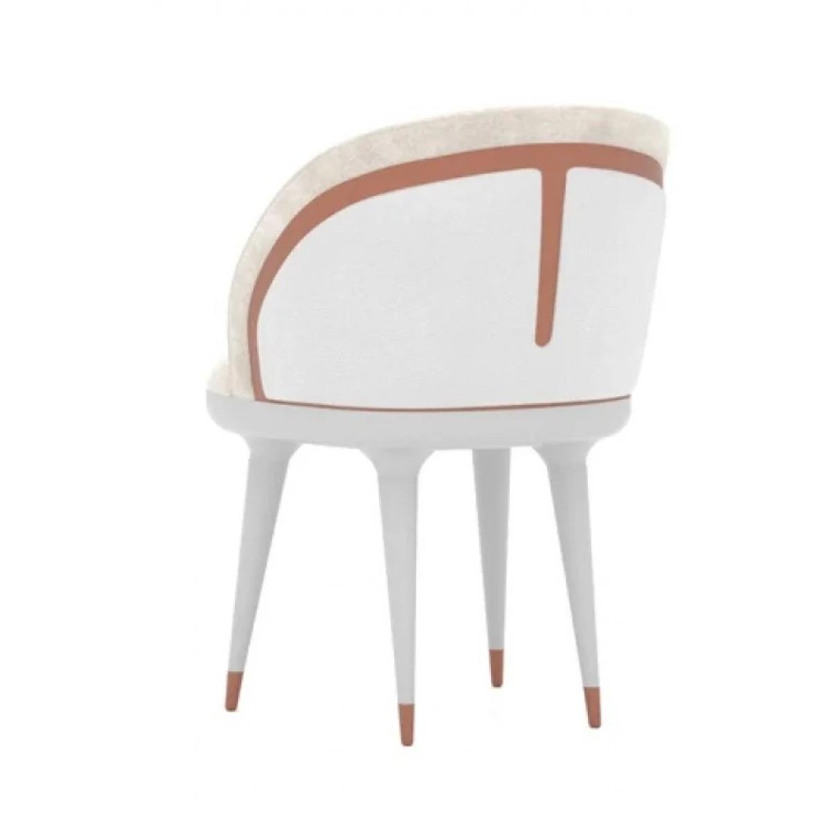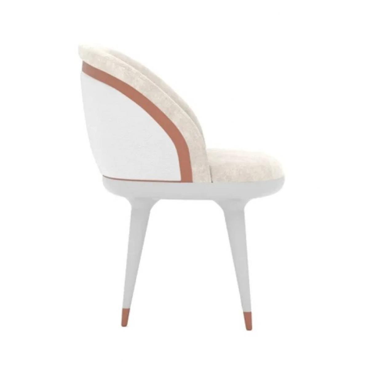 The title highlights the defining elements—white upholstery, modern form, and distinctive copper finish design—each contributing to its luxurious appeal. As a luxury dining chair, it complements high-end dining spaces, designer apartments, and boutique hospitality interiors. The light neutral palette pairs beautifully with marble, glass, or dark wood tables, making it a versatile centerpiece for refined dining environments.