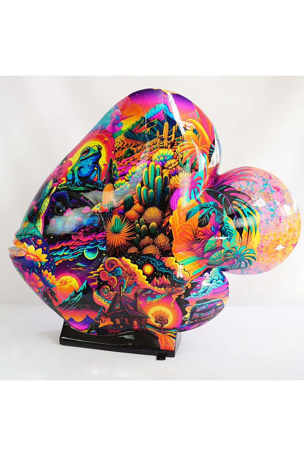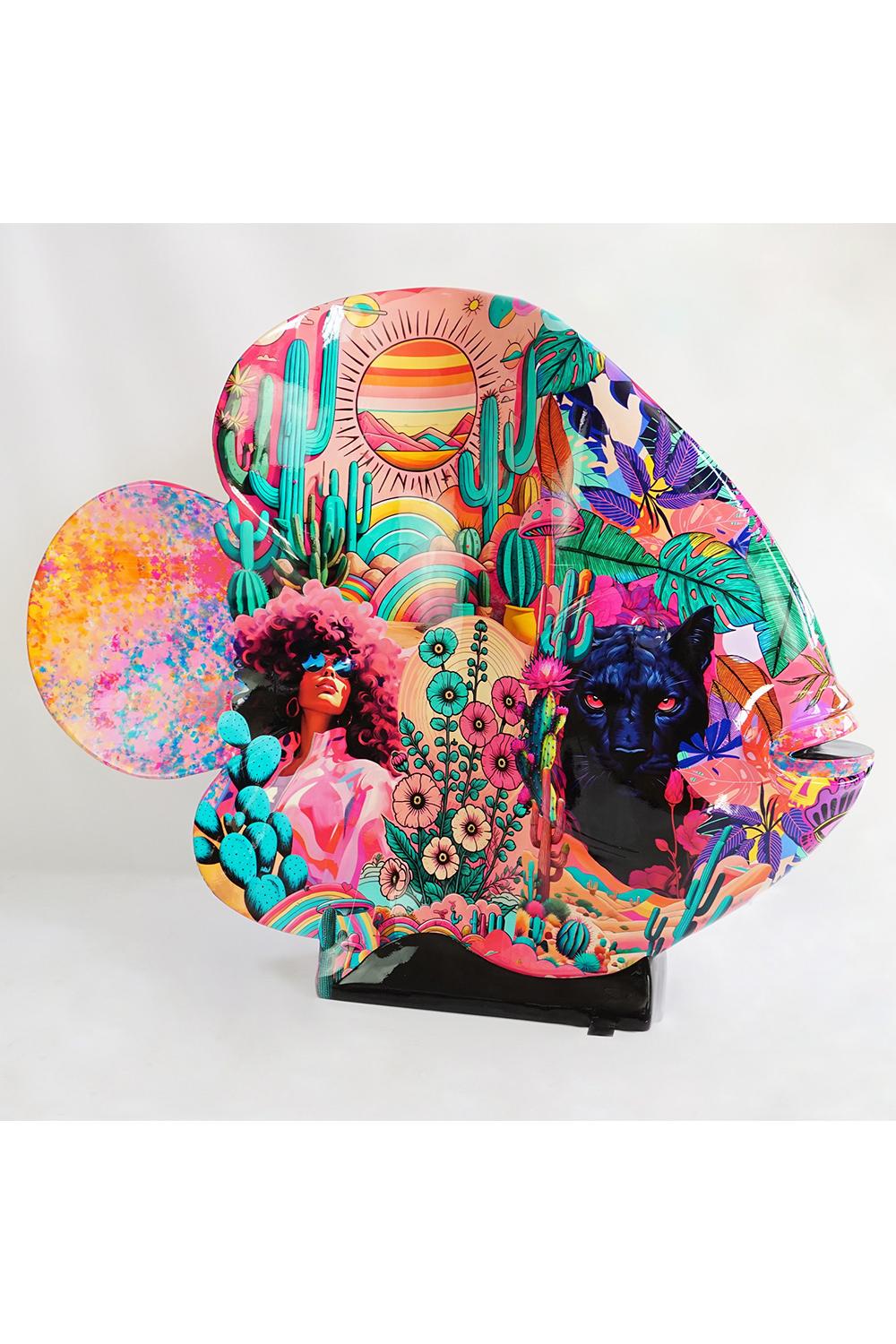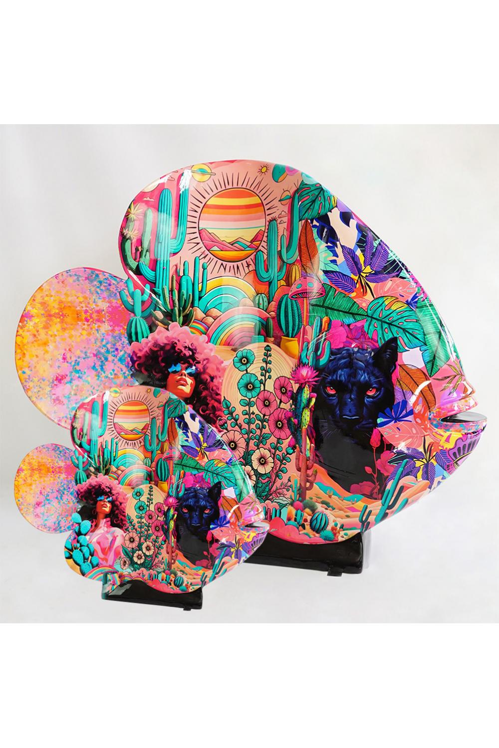 The XL Fish Sculpture with Mexican Motifs is a bold celebration of color, culture, and creativity. Crafted from premium polyester resin, this 110 cm abstract piece is wrapped in vibrant Mexican-inspired artwork depicting flora, fauna, and sunlit desert scenes. Its imaginative design reflects the spirit of Mexican art — joyful, dynamic, and deeply expressive — while maintaining the refined craftsmanship expected in European luxury décor.