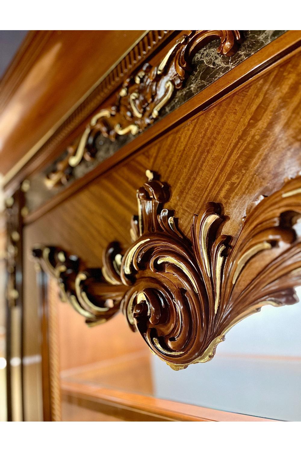 The Majestic 1-Door Walnut Showcase is an expression of refined European artistry. Built from walnut and myrtle briar wood, enhanced with bois de roses and mother-of-pearl inlays set into Emperador marble, and finished with hand-applied gold patina, it brings a sense of royal grandeur to sophisticated interiors.