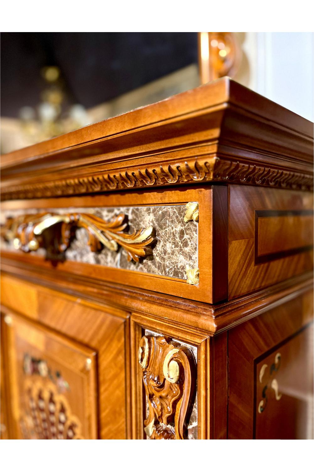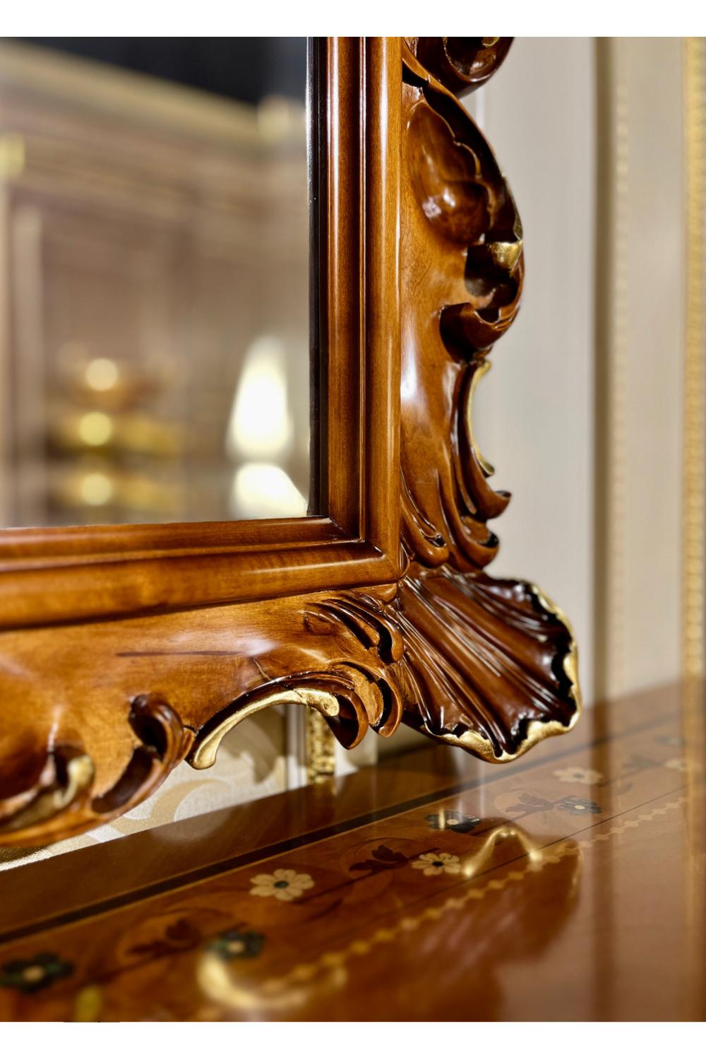 The Majestic Premium Dressing Table blends walnut elegance with hand-applied gold-leaf patina, offering an exquisite balance of artistry and practicality. Framed in warm walnut tones, it features a refined mirror over sideboard design that enhances light, depth, and luxury within any sophisticated interior.