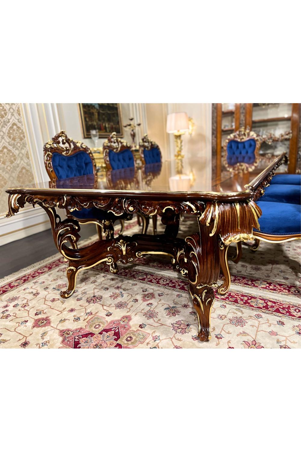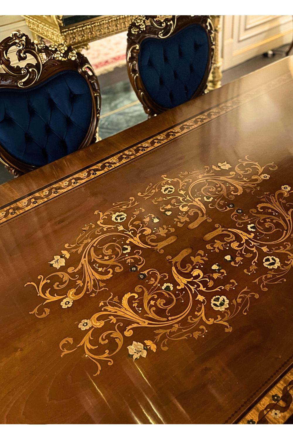 The Baroque Walnut Inlay Dining Table represents the pinnacle of European artistry and grandeur. Crafted from solid walnut with hand-finished inlays and gold-patinated detailing, this table transforms any dining space into a scene of regal sophistication and timeless style.